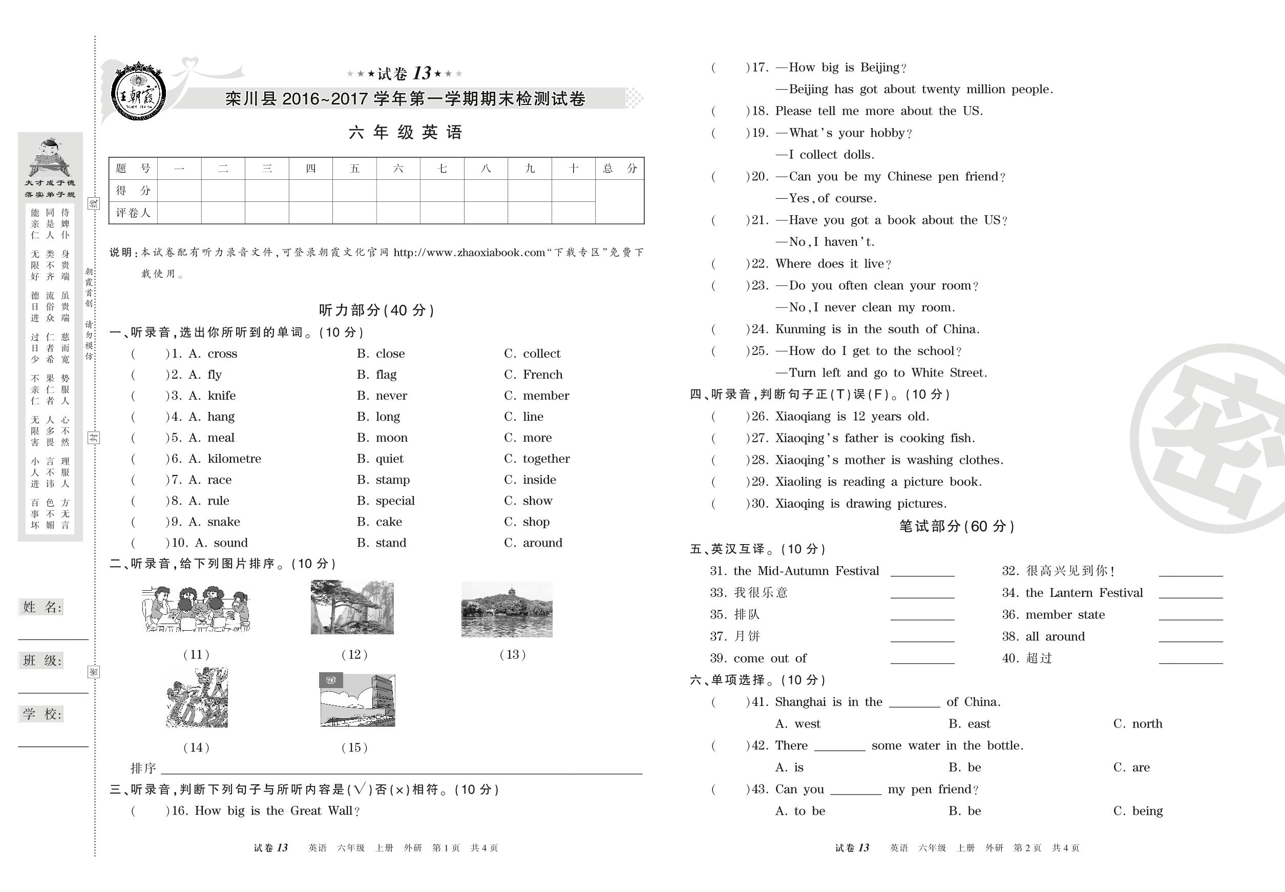 2016-2017学年第一学期洛阳市栾川县六年级英语试卷(外研版)【13】