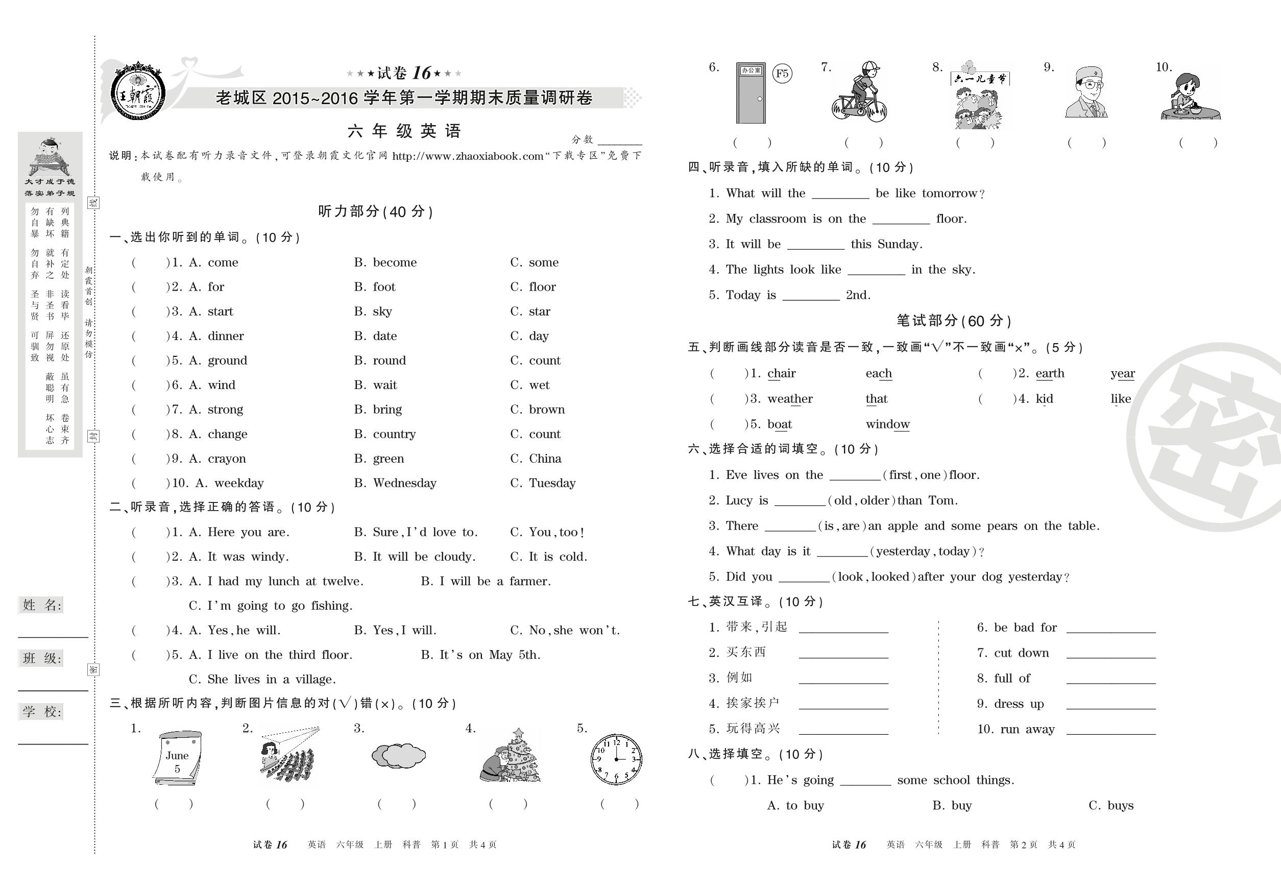 2015-2016学年第一学期洛阳市老城区六年级英语试卷(科普版)【16】
