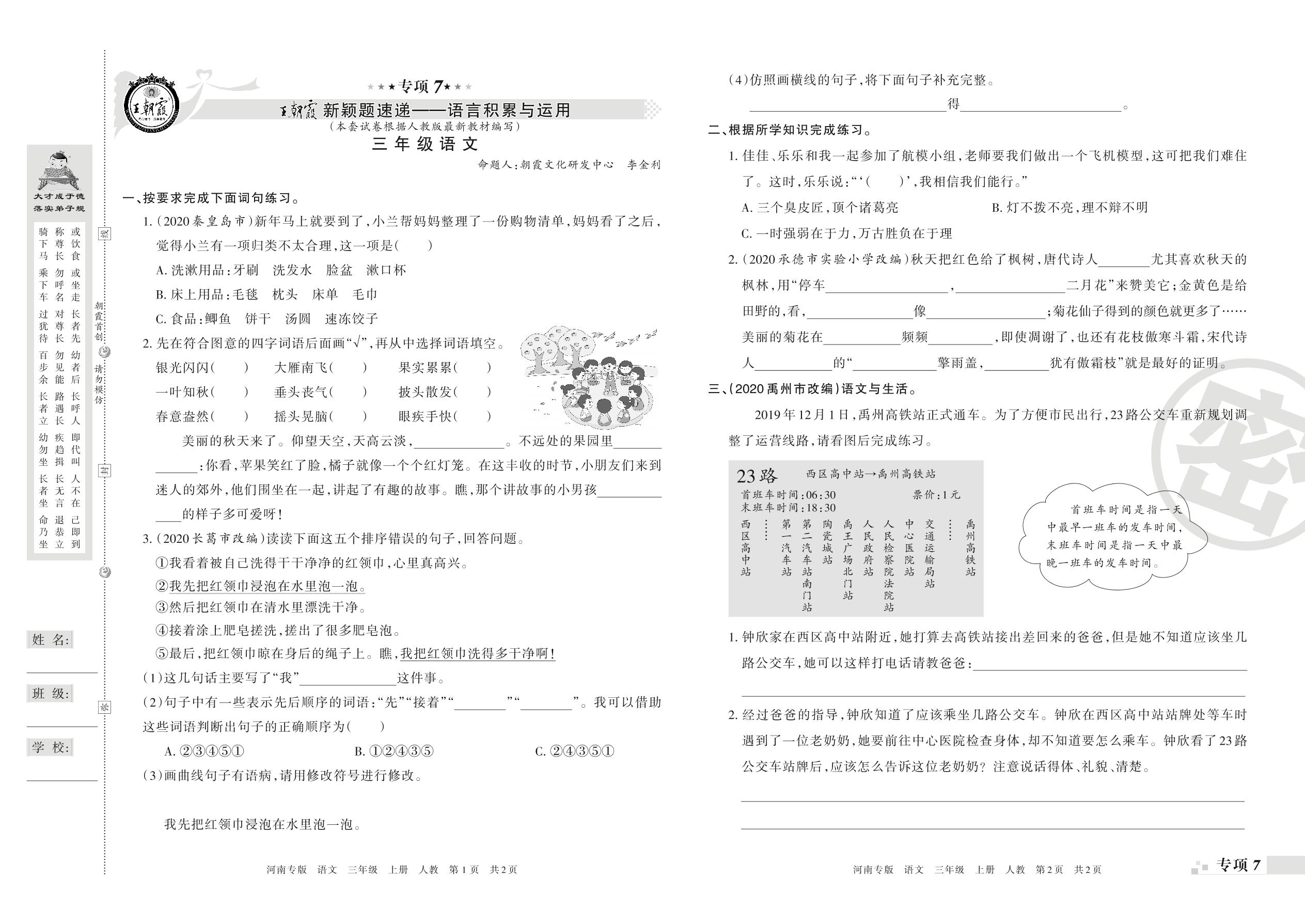 王朝霞期末专项卷——语言积累与运用、非连续性文本阅读三年级上册语文(人教版)_R211022153322638【0】