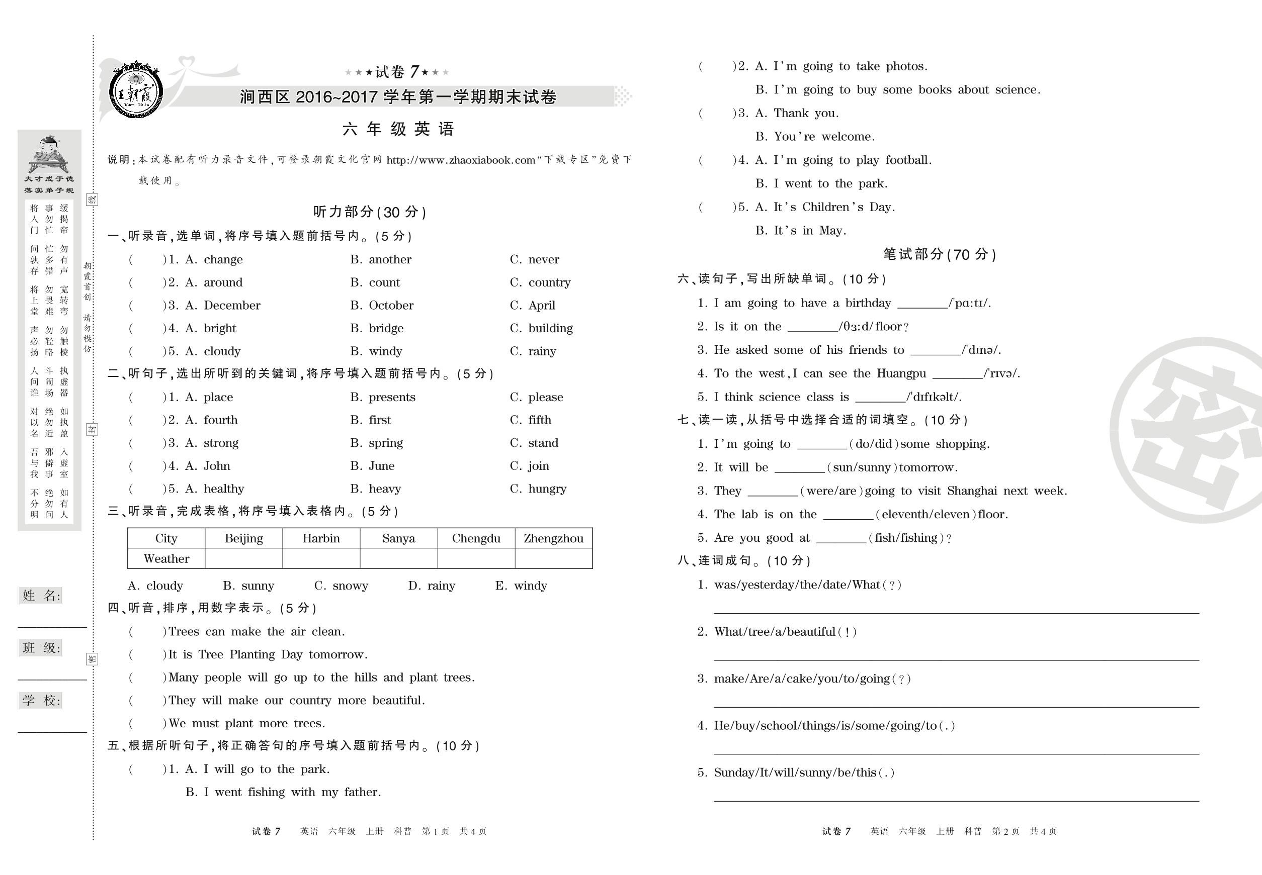 2016-2017学年第一学期洛阳市涧西区六年级英语试卷(科普版)【7】