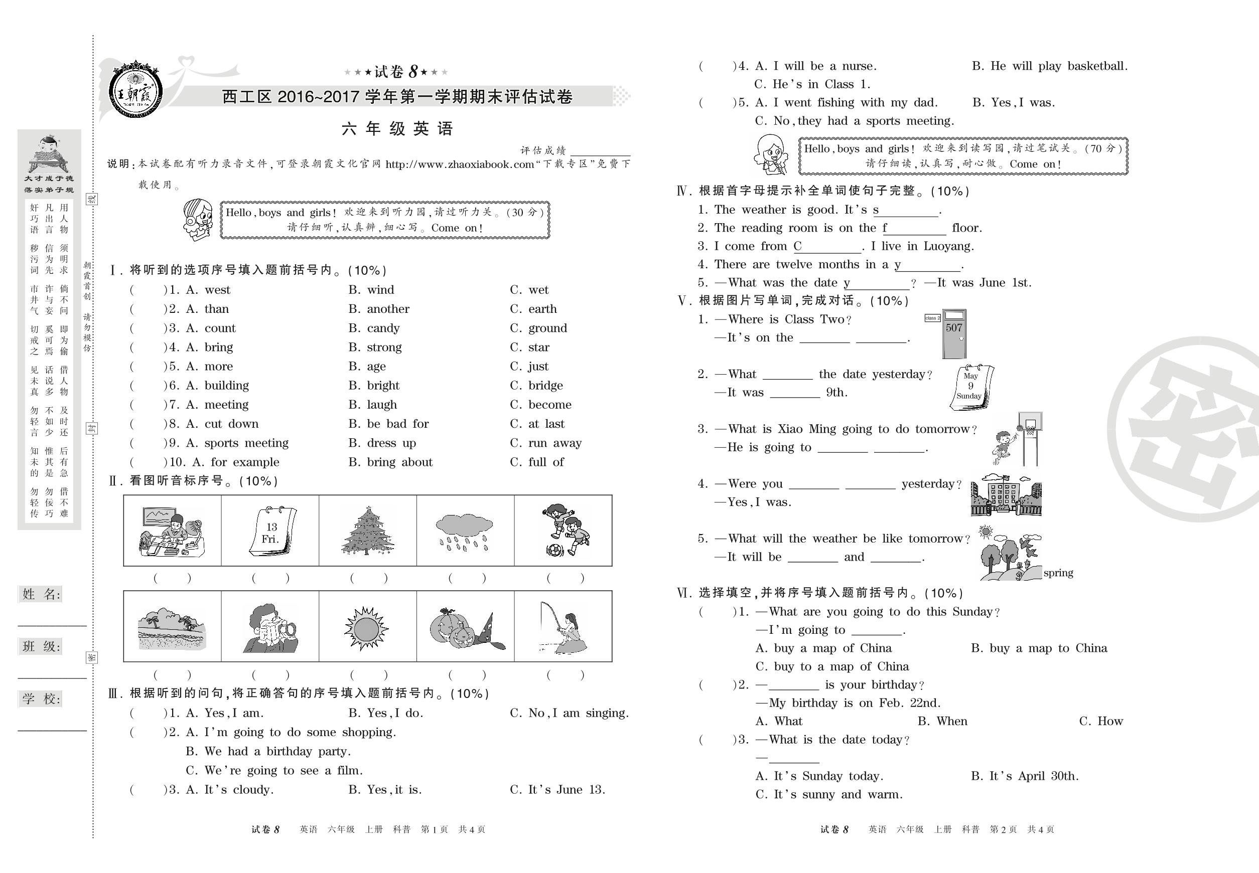 2016-2017学年第一学期洛阳市西工区六年级英语试卷(科普版)【8】