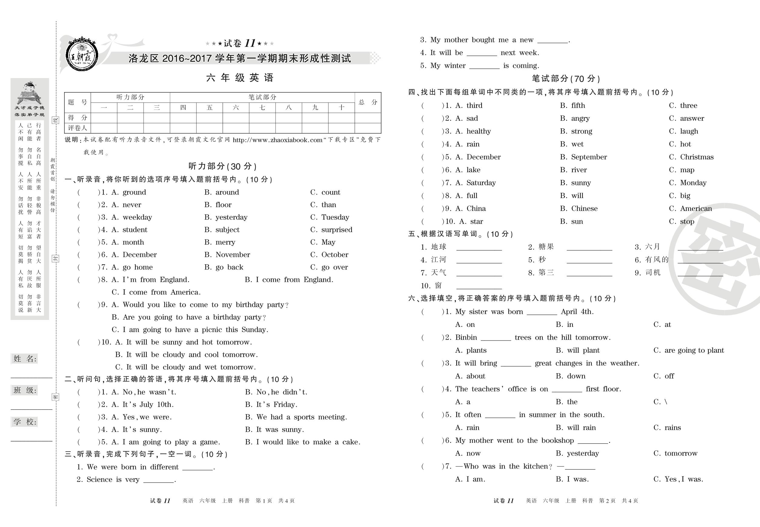2016-2017学年第一学期洛阳市洛龙区六年级英语试卷(科普版)【11】