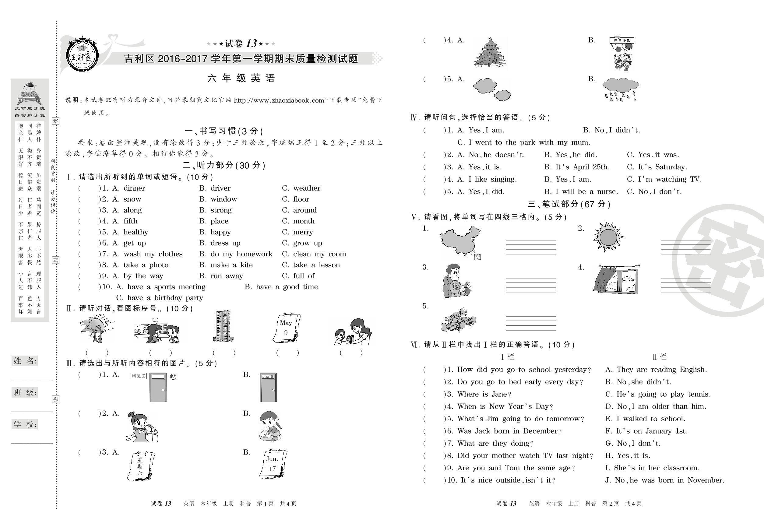 2016-2017学年第一学期洛阳市吉利区六年级英语试卷(科普版)【13】