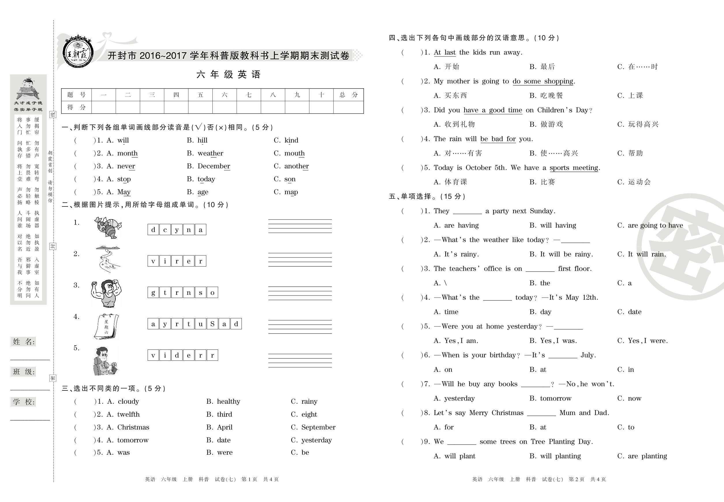 2016-2017学年第一学期开封市六年级英语试卷(科普版)【7】