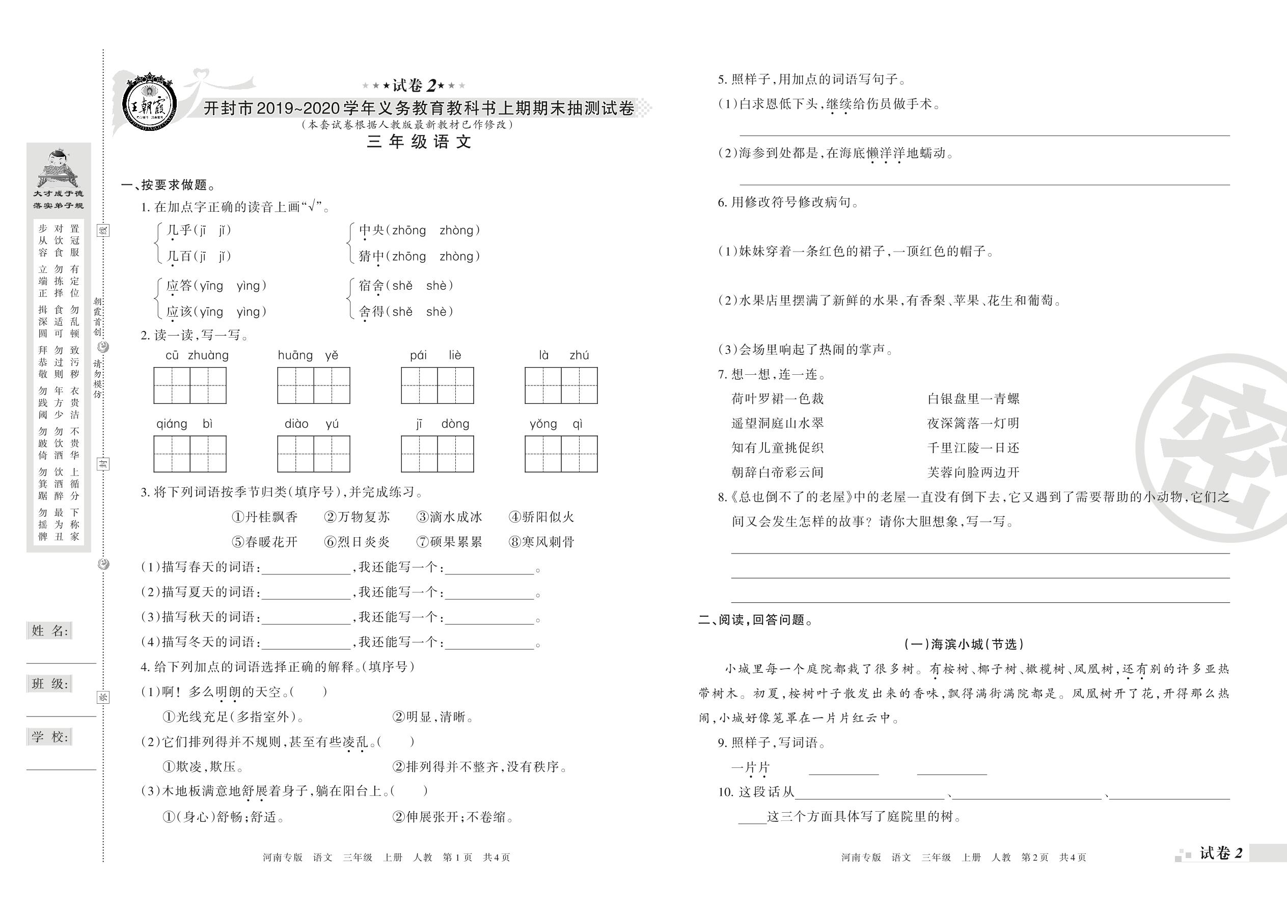 2019-2020学年第一学期开封市三年级语文试卷(人教版)【2】