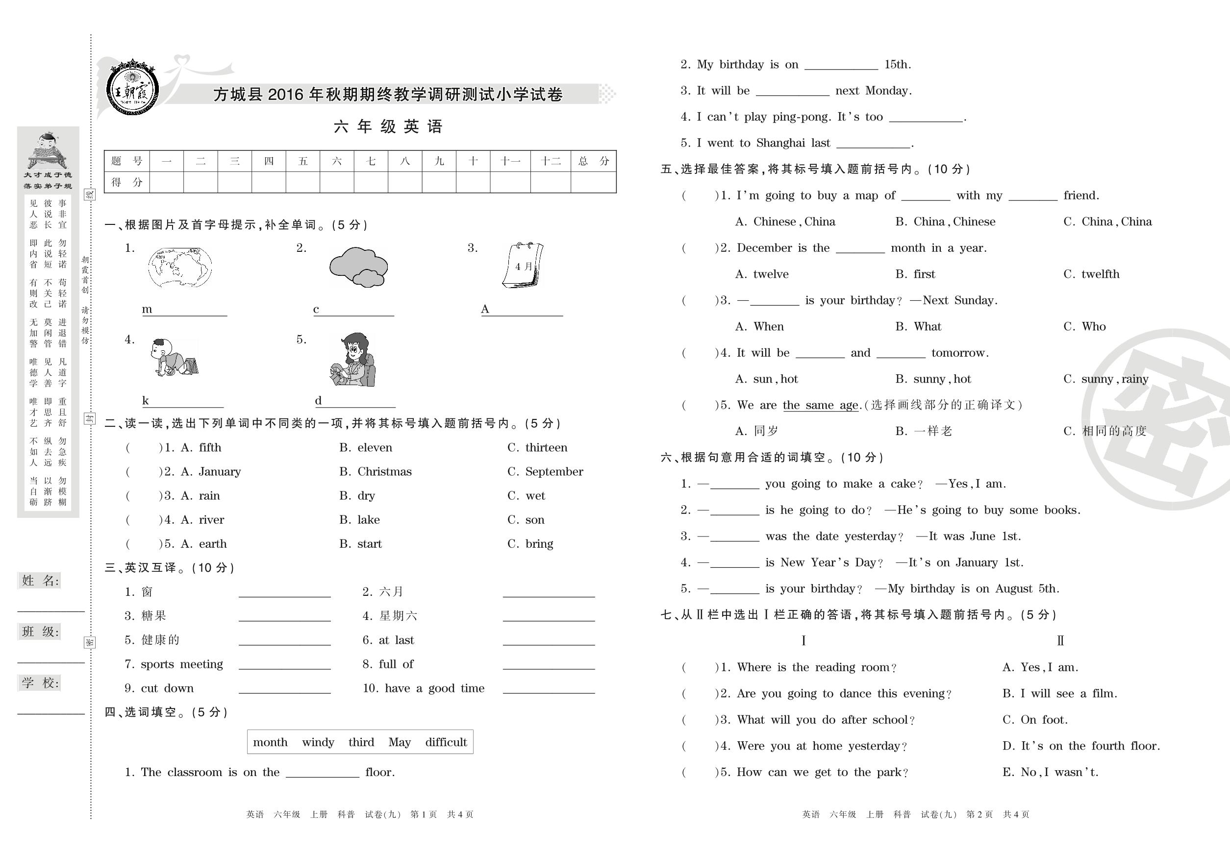 2016-2017学年第一学期南阳市方城县六年级英语试卷(科普版)【9】