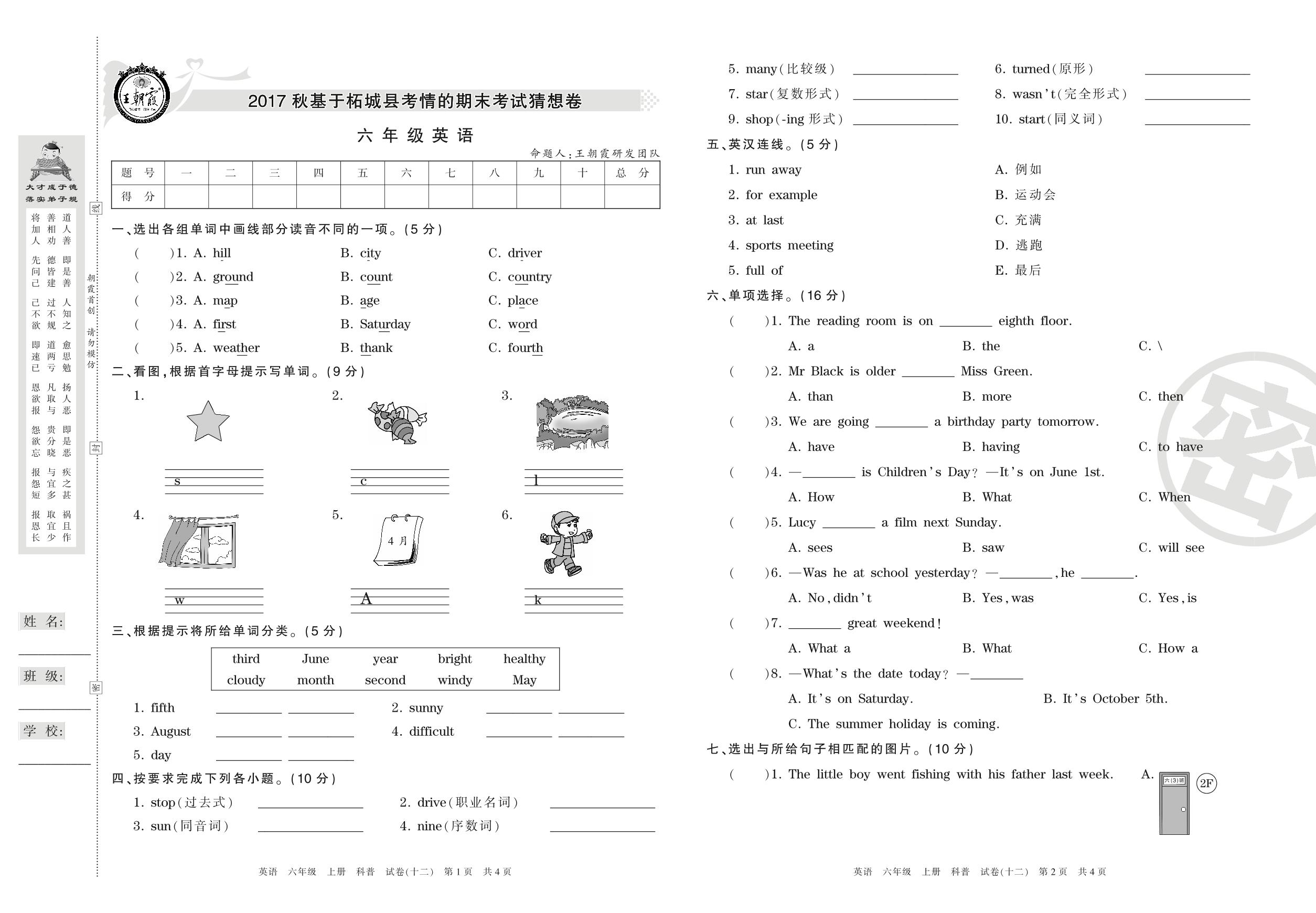 2016-2017学年第一学期商丘市柘城县六年级英语试卷(科普版)【12】