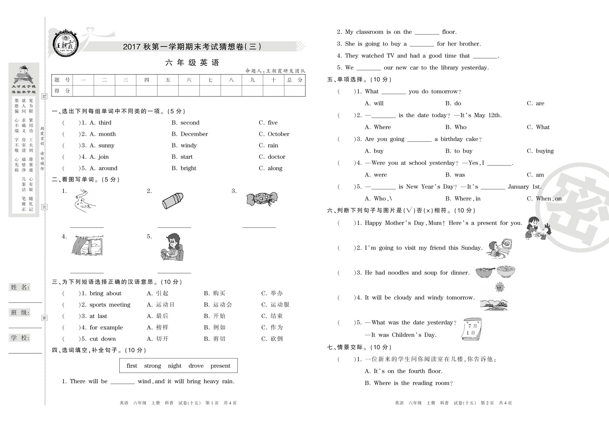 王朝霞期末猜想卷六年级上册英语(科普版)【15】