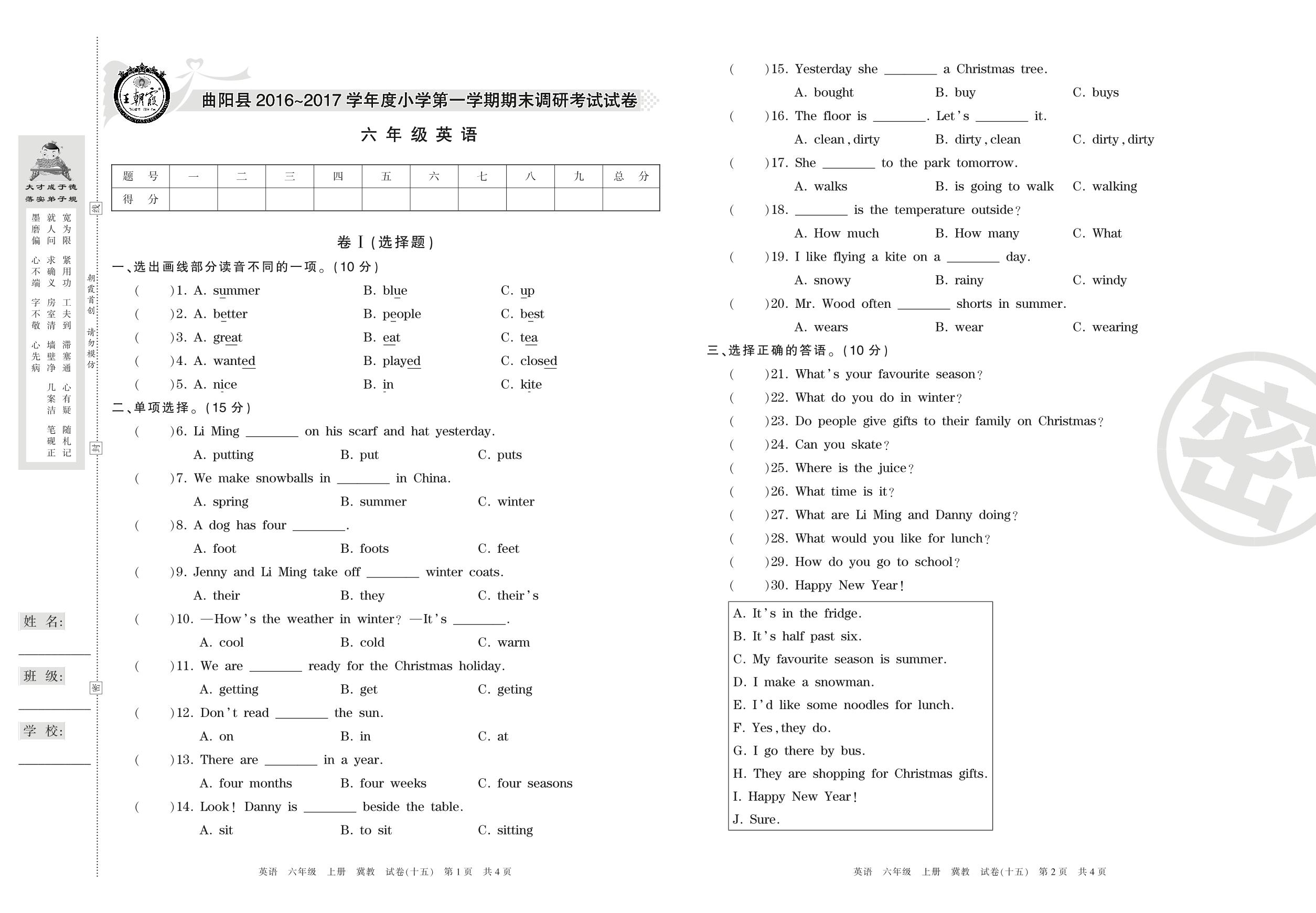 2016-2017学年第一学期保定市曲阳县六年级英语试卷(冀教版)【15】