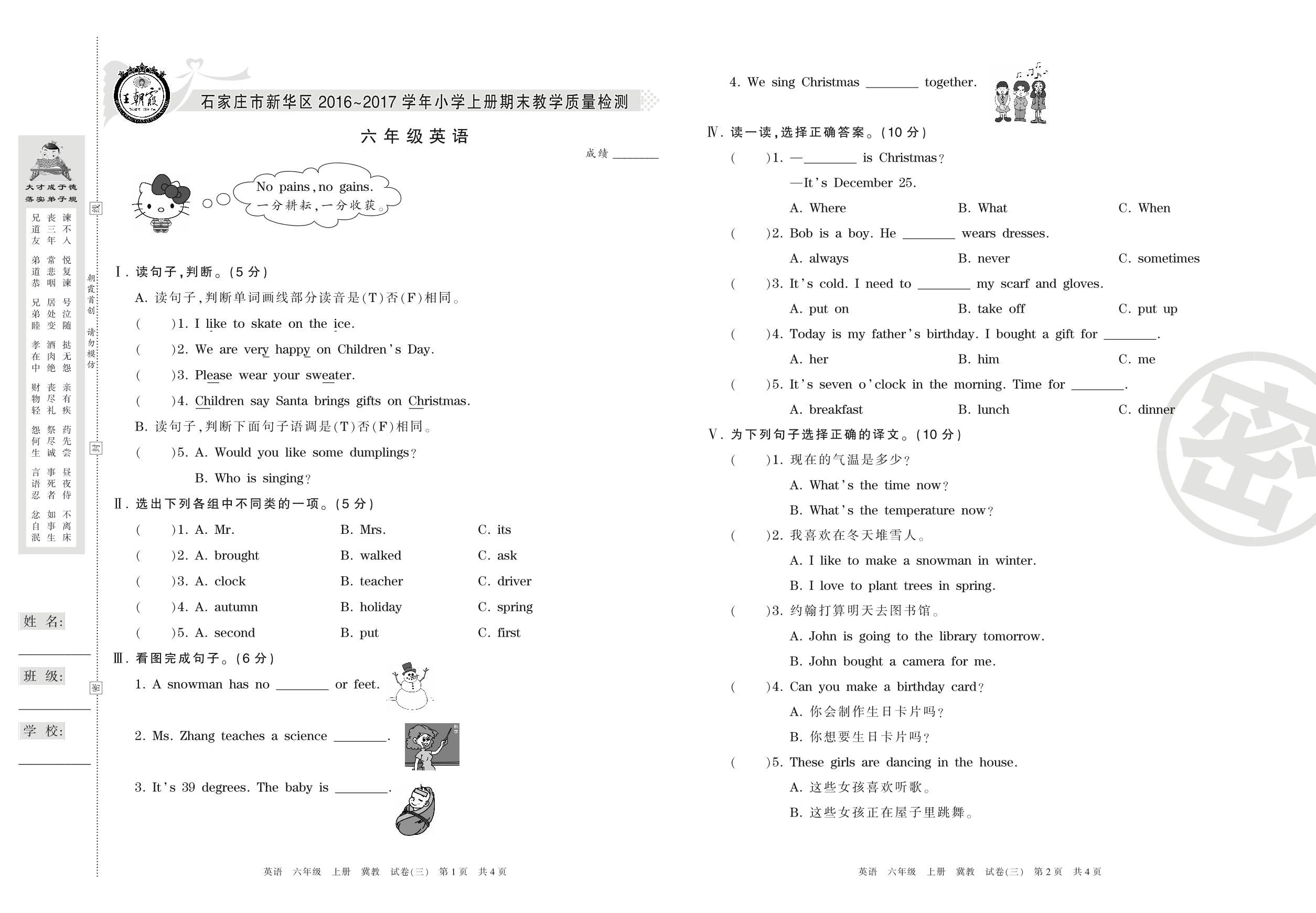 2016-2017学年第一学期石家庄市新华区六年级英语试卷(冀教版)【3】