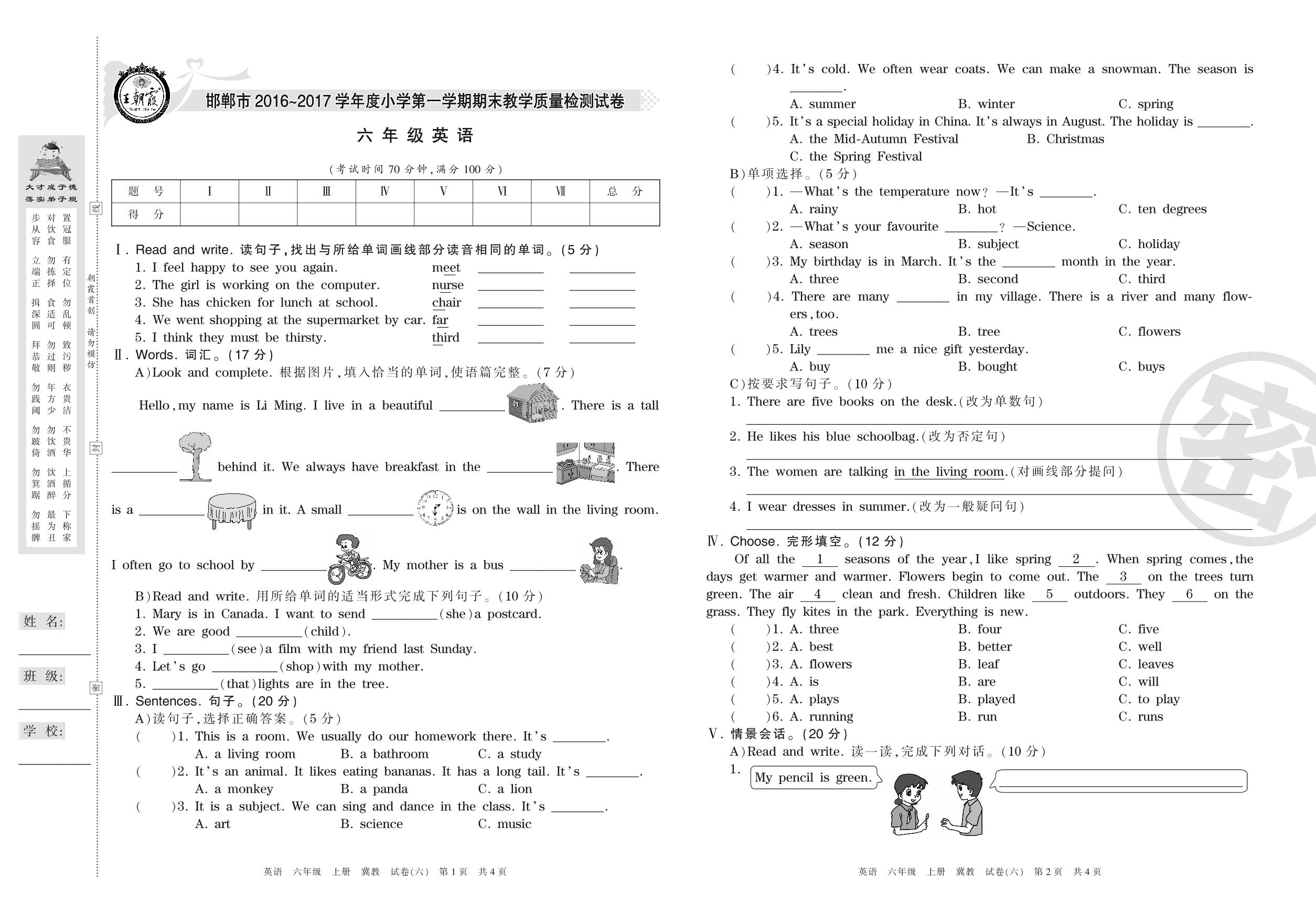 2016-2017学年第一学期邯郸市六年级英语试卷(冀教版)【6】