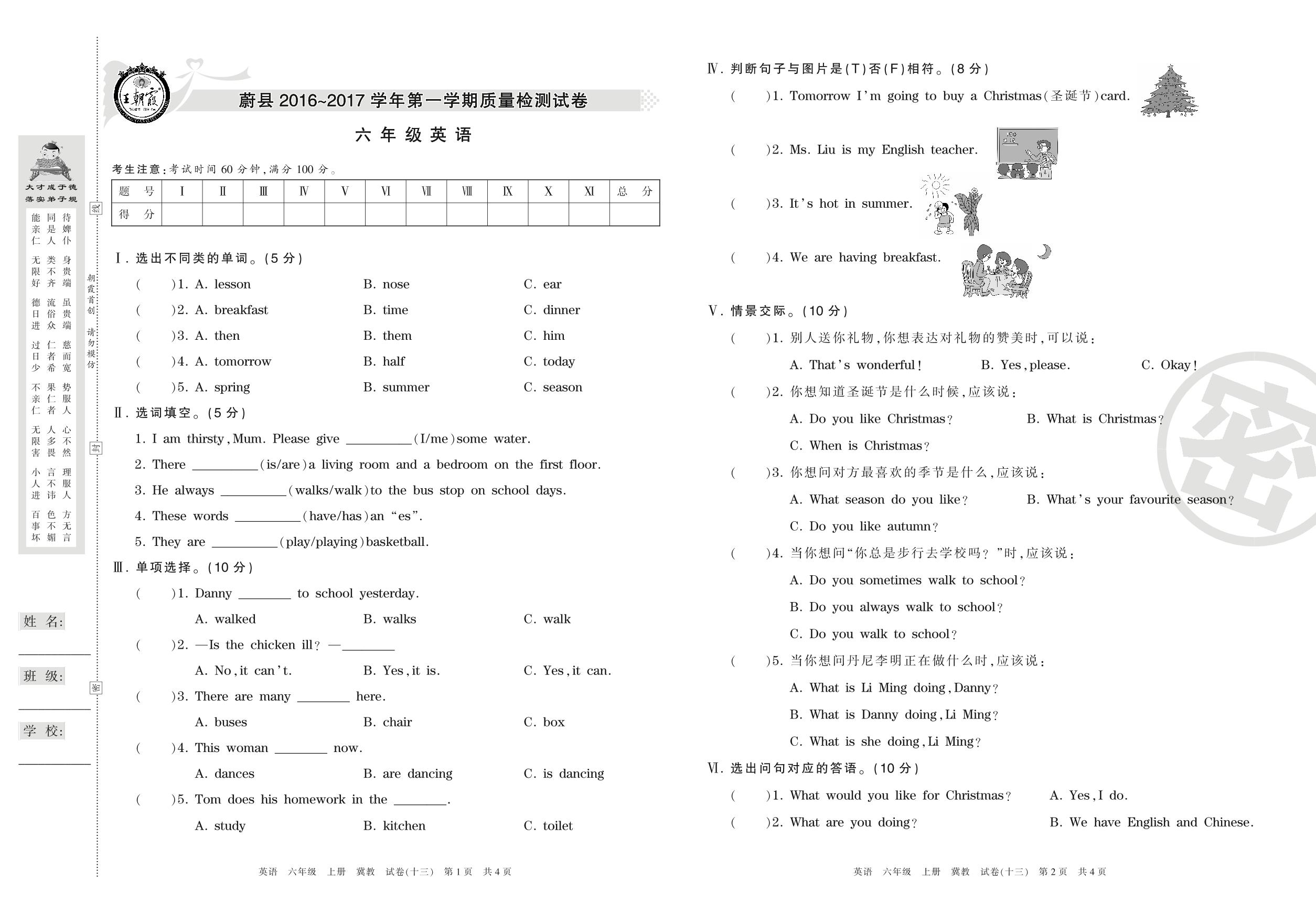 2016-2017学年第一学期张家口市蔚县六年级英语试卷(冀教版)【13】
