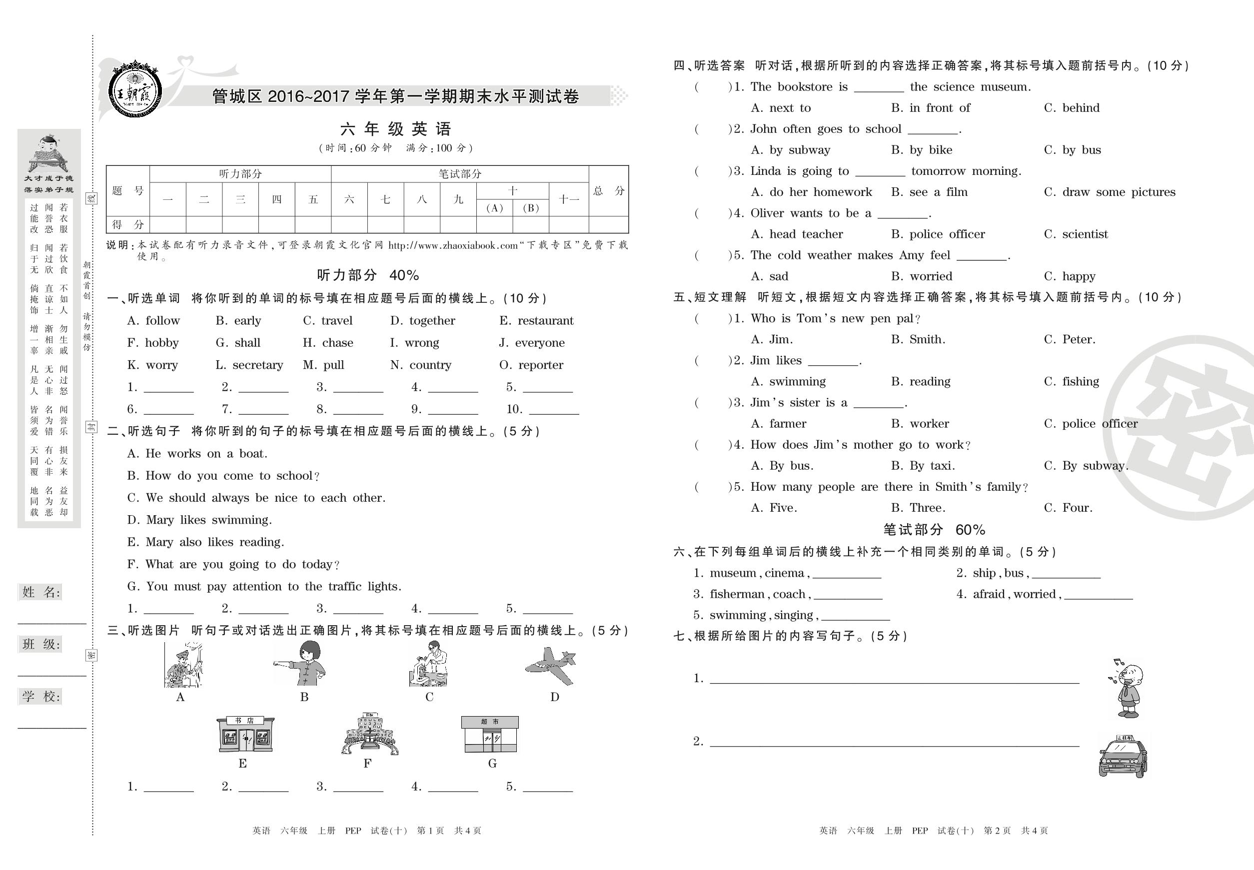 2016-2017学年第一学期郑州市管城区六年级英语试卷(PEP版)【10】