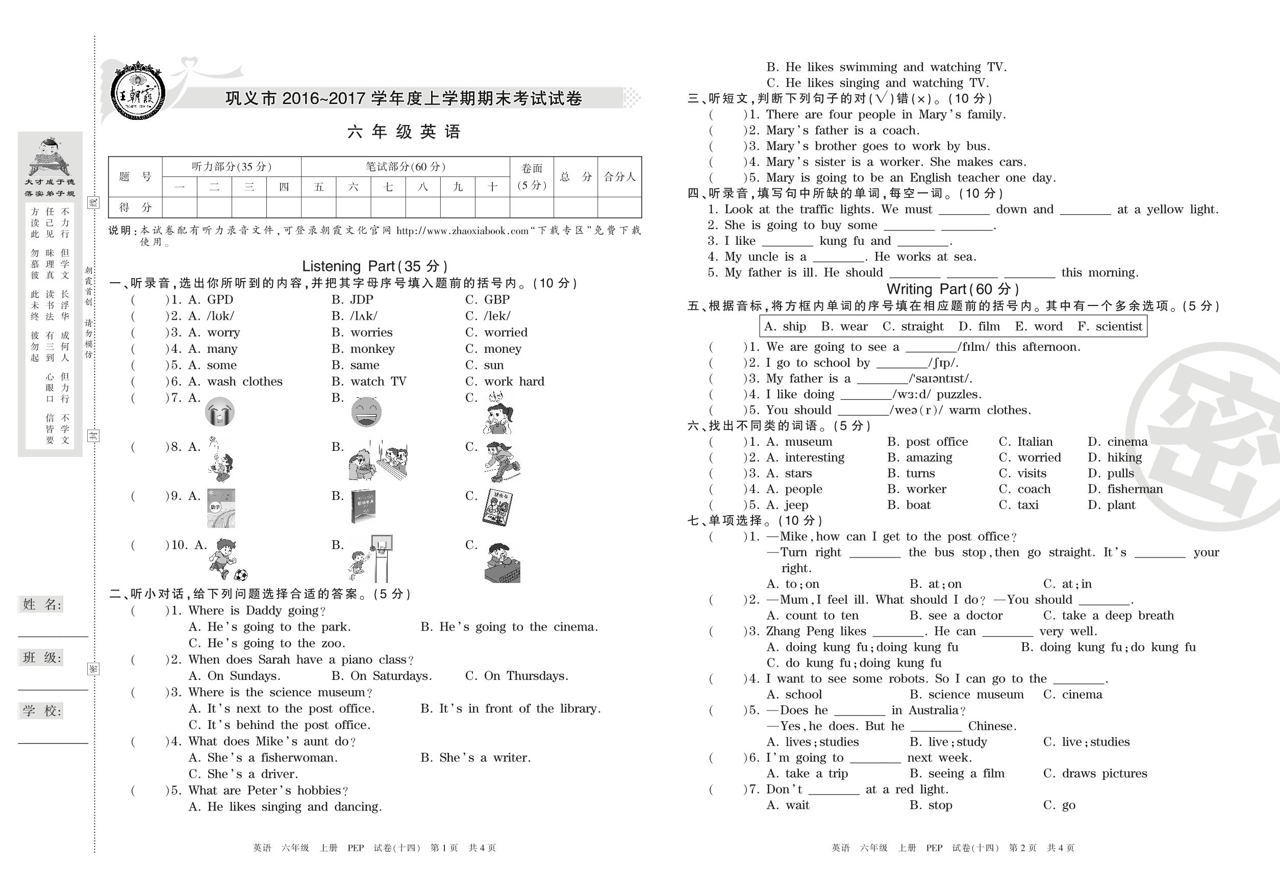 2016-2017学年第一学期巩义市六年级英语试卷(PEP版)【14】