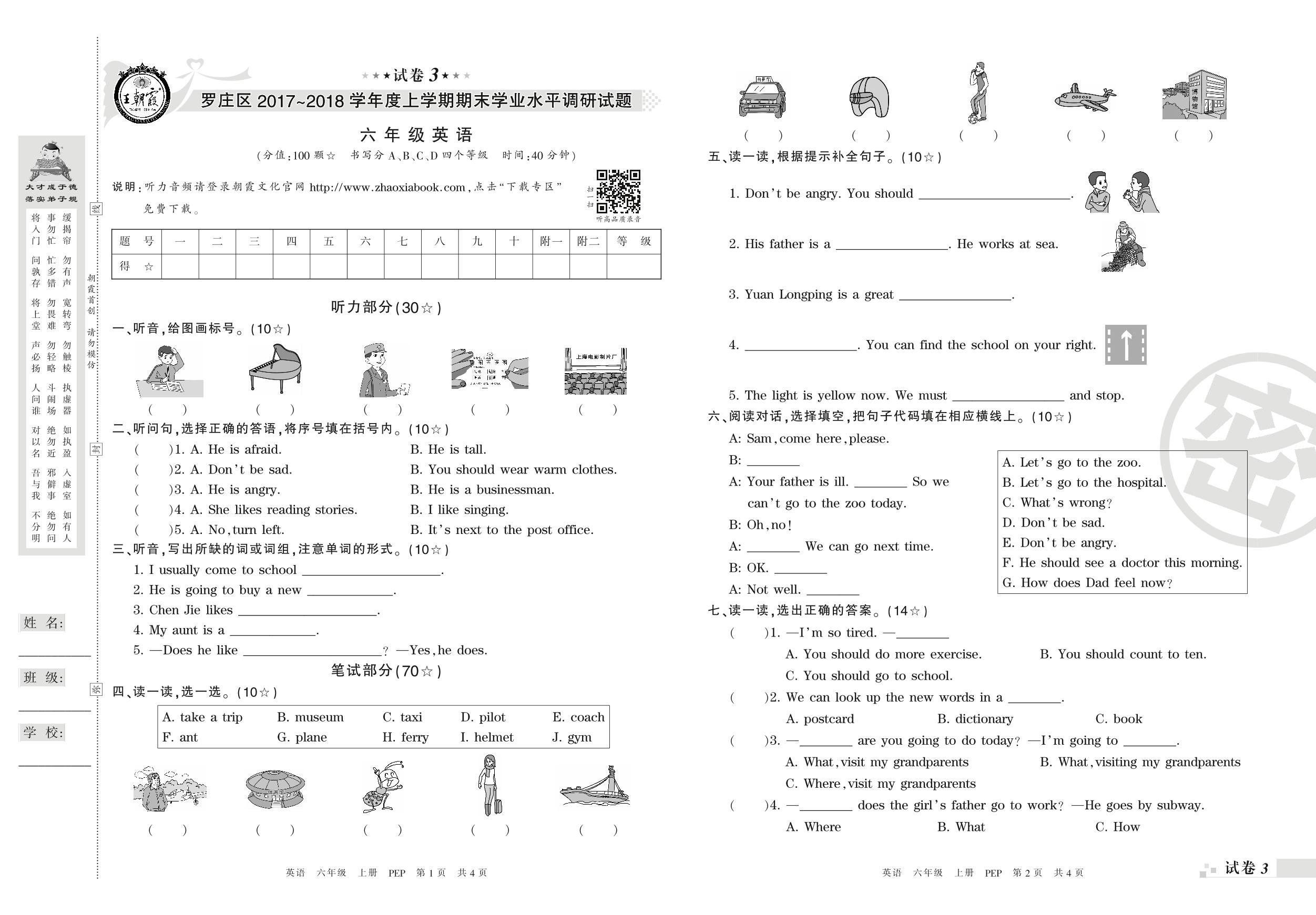 2017-2018学年第一学期临沂市罗庄区六年级英语试卷(PEP版)【3】