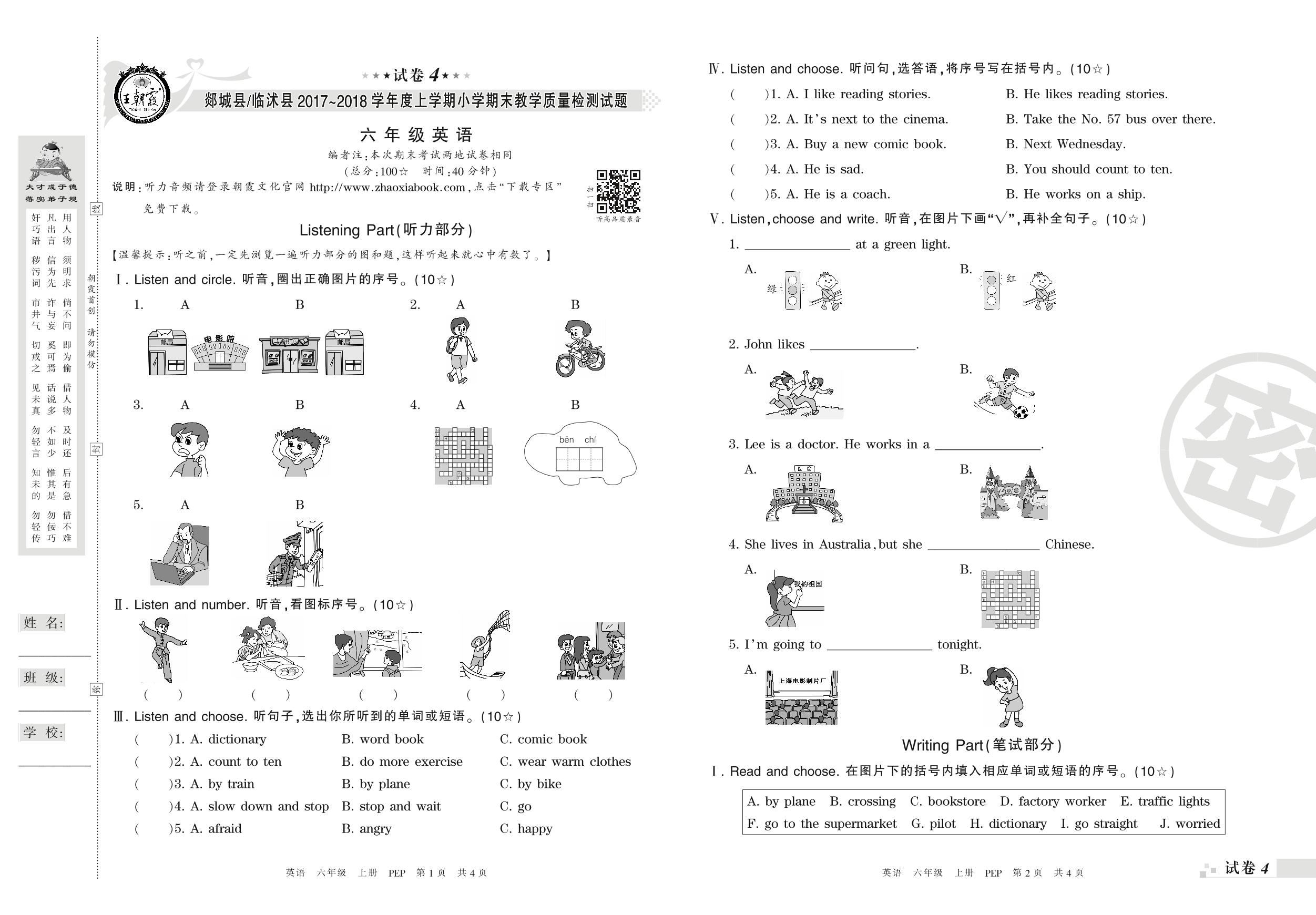 2017-2018学年第一学期临沂市郯城县、临沭县六年级英语试卷(PEP版)【4】