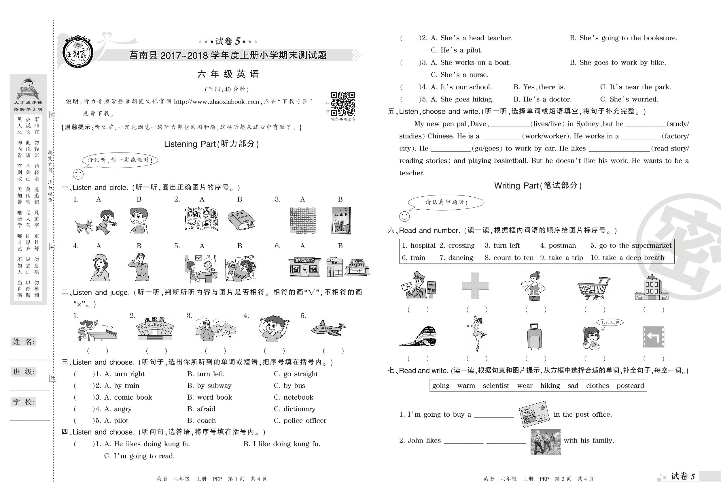 2017-2018学年第一学期临沂市莒南县六年级英语试卷(PEP版)【5】