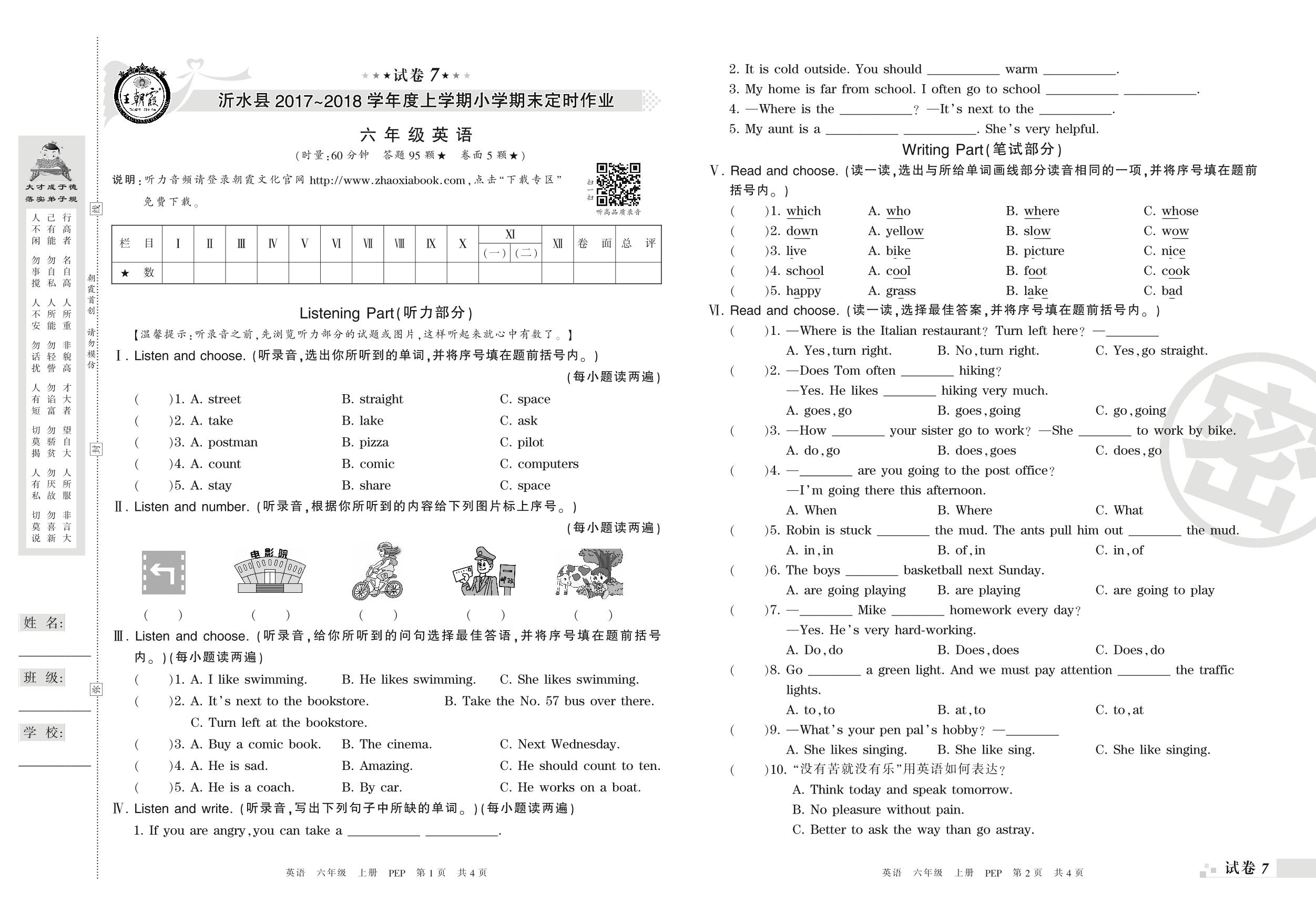 2017-2018学年第一学期临沂市沂水县六年级英语试卷(PEP版)【7】