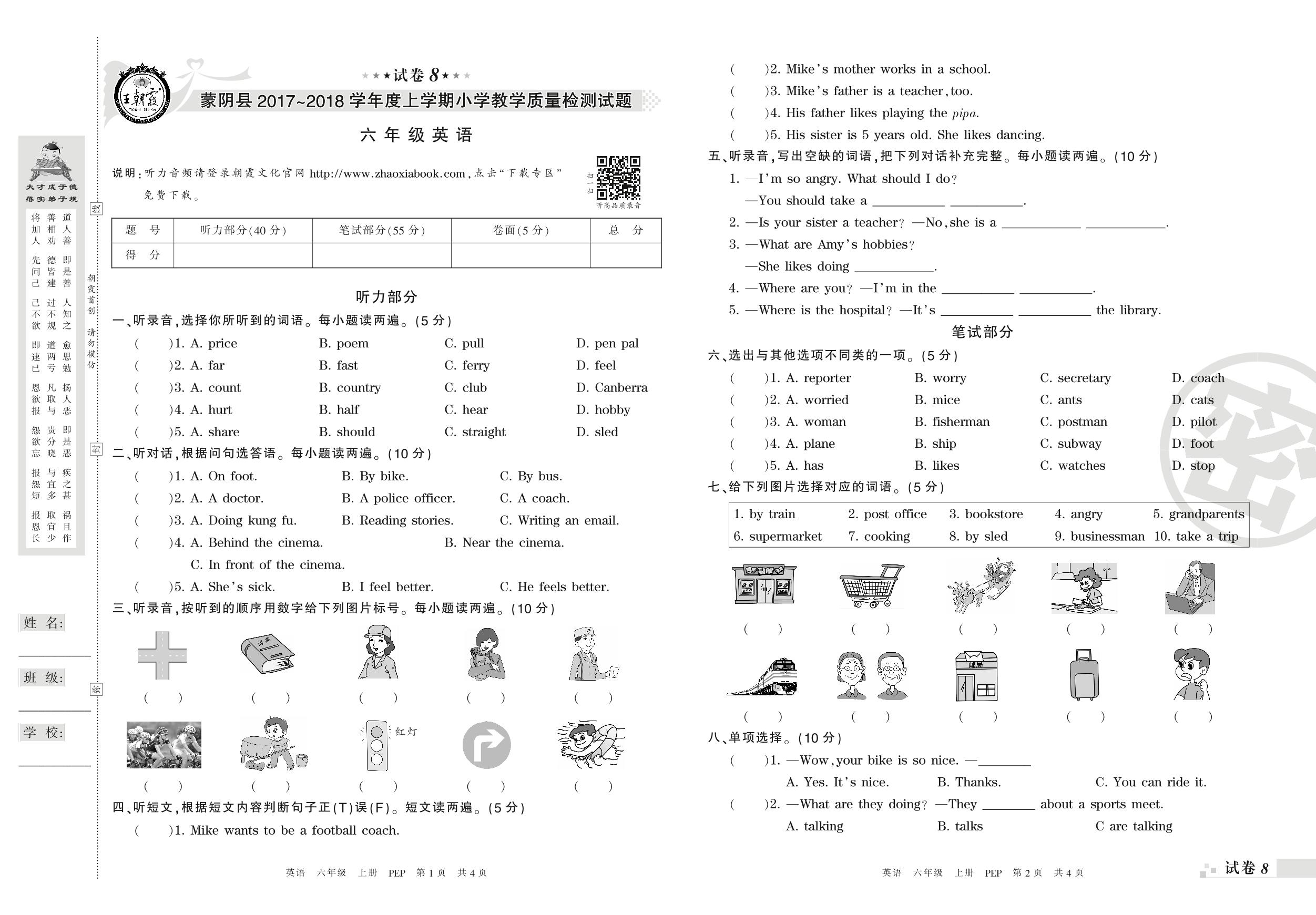 2017-2018学年第一学期临沂市蒙阴县六年级英语试卷(PEP版)【8】