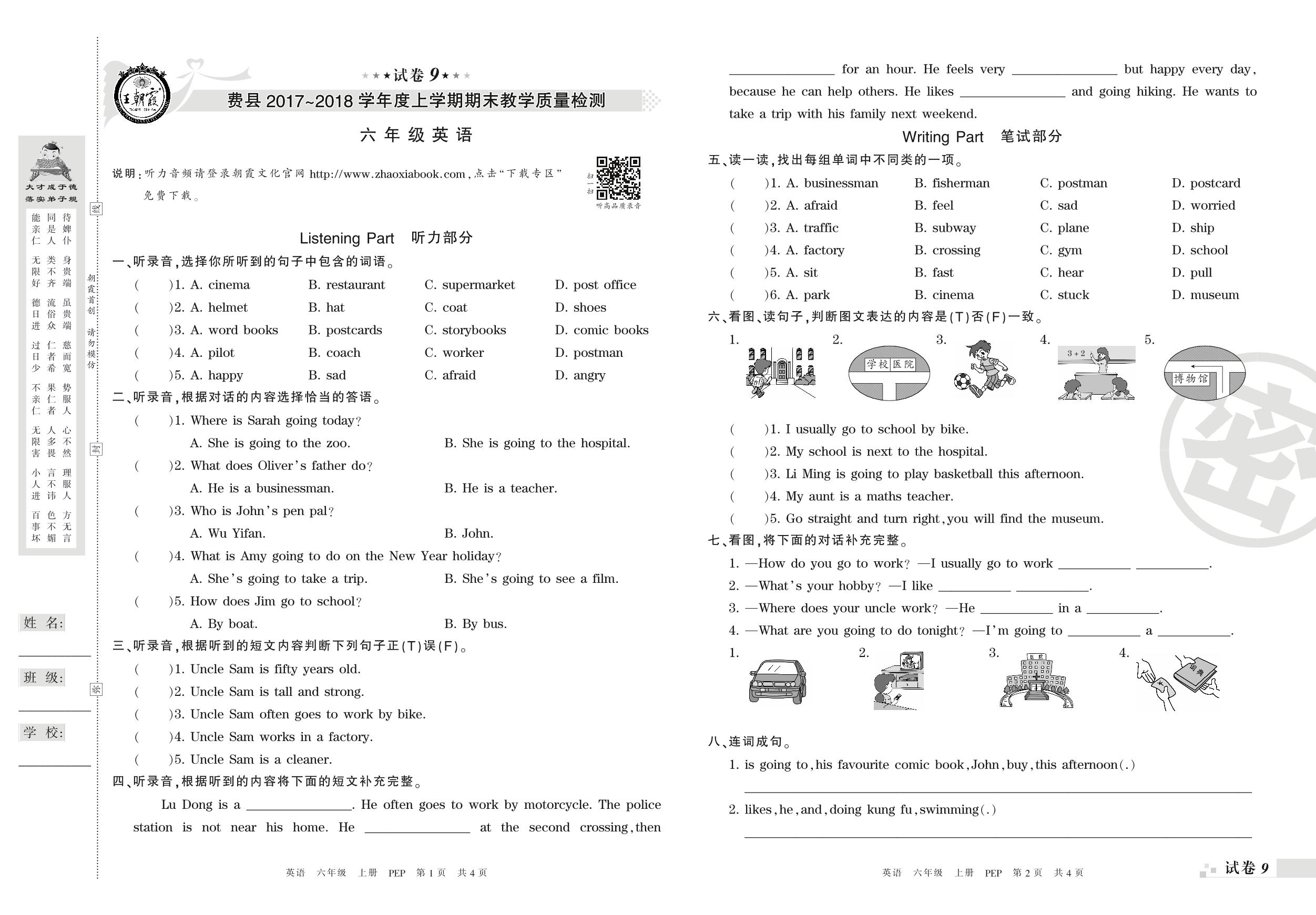 2017-2018学年第一学期临沂市费县六年级英语试卷(PEP版)【9】