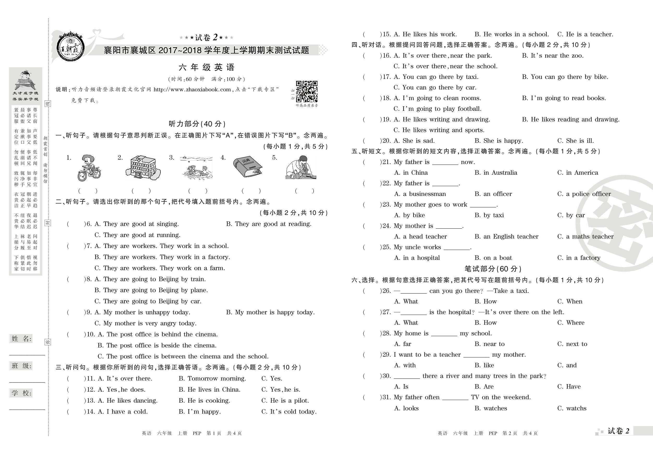 2017-2018学年第一学期襄阳市襄城区六年级英语试卷(PEP版)【2】