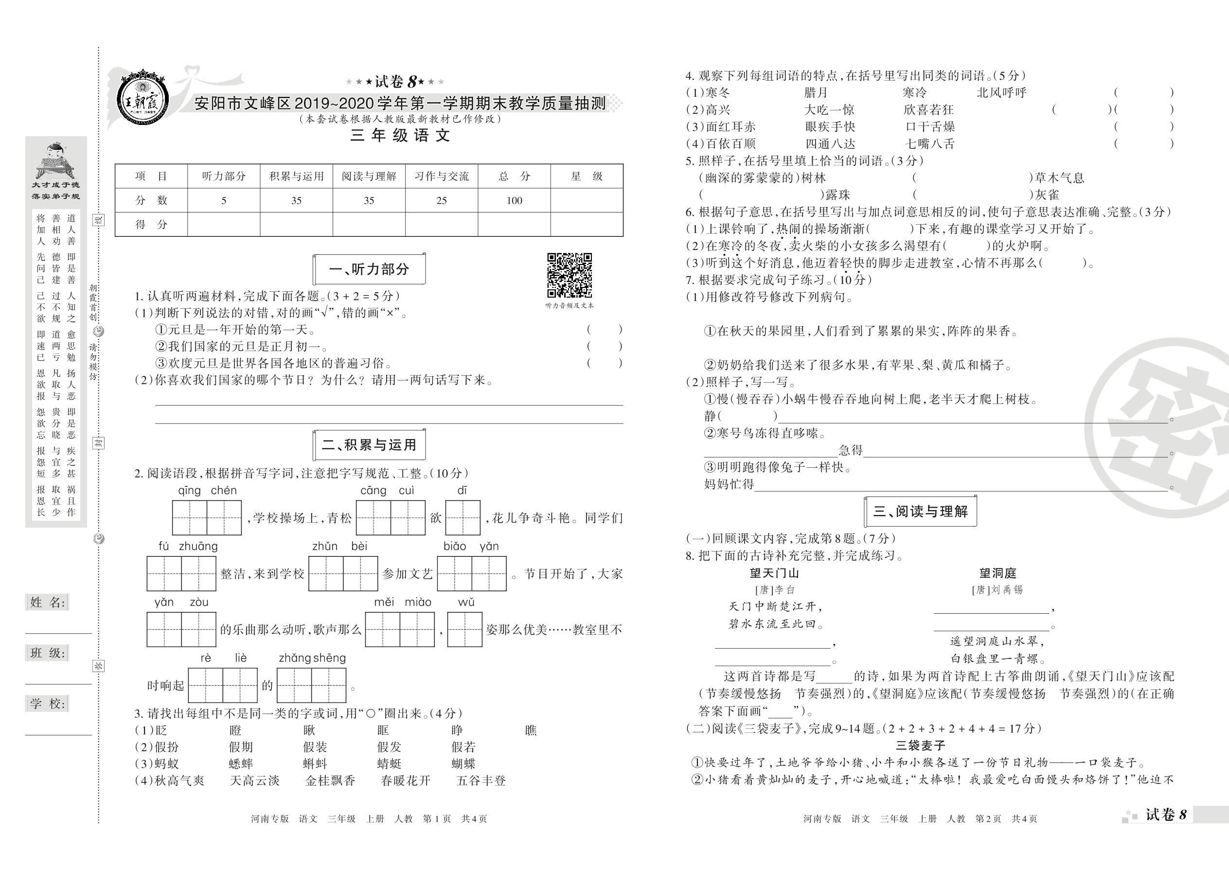 2019-2020学年第一学期安阳市文峰区三年级语文试卷(人教版)【8】