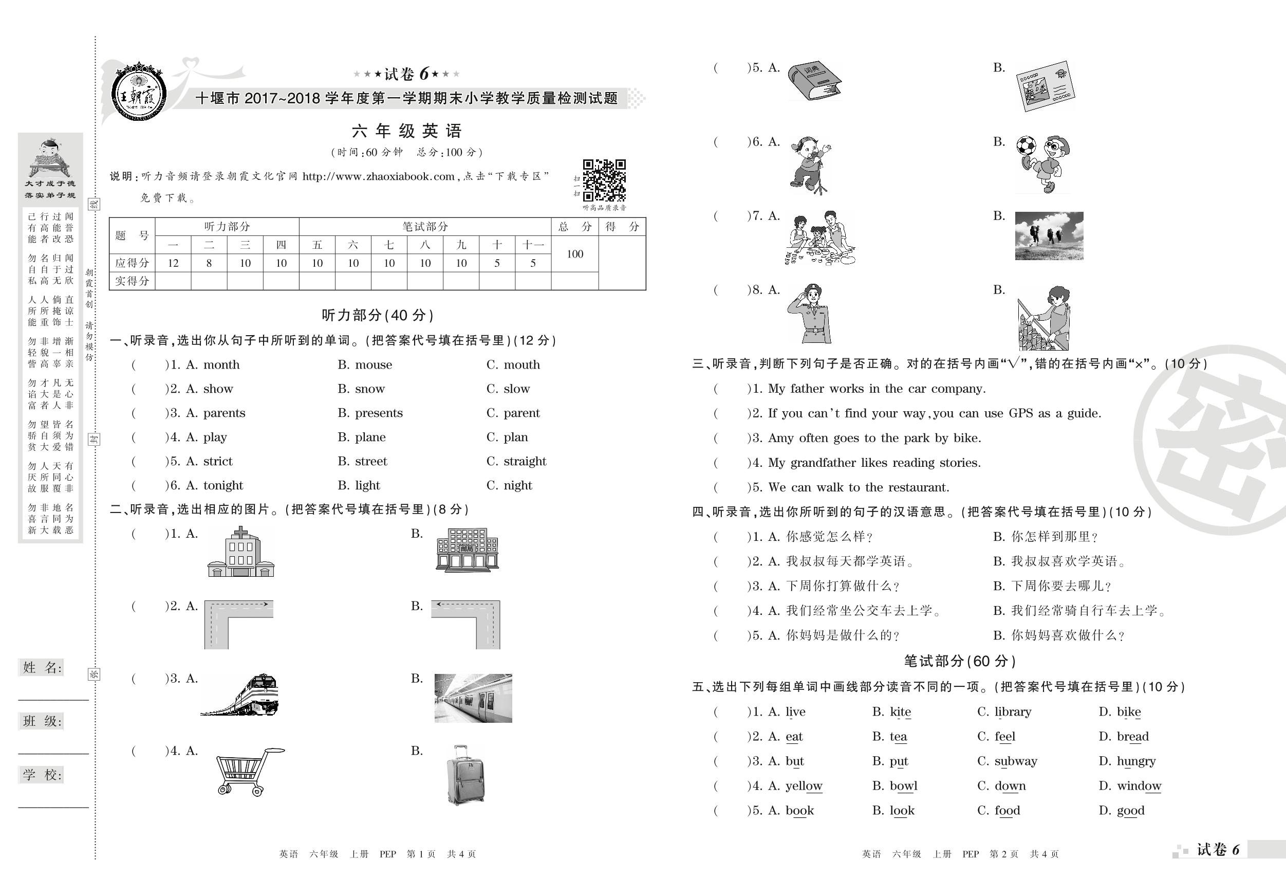 2017-2018学年第一学期十堰市六年级英语试卷(PEP版)【6】