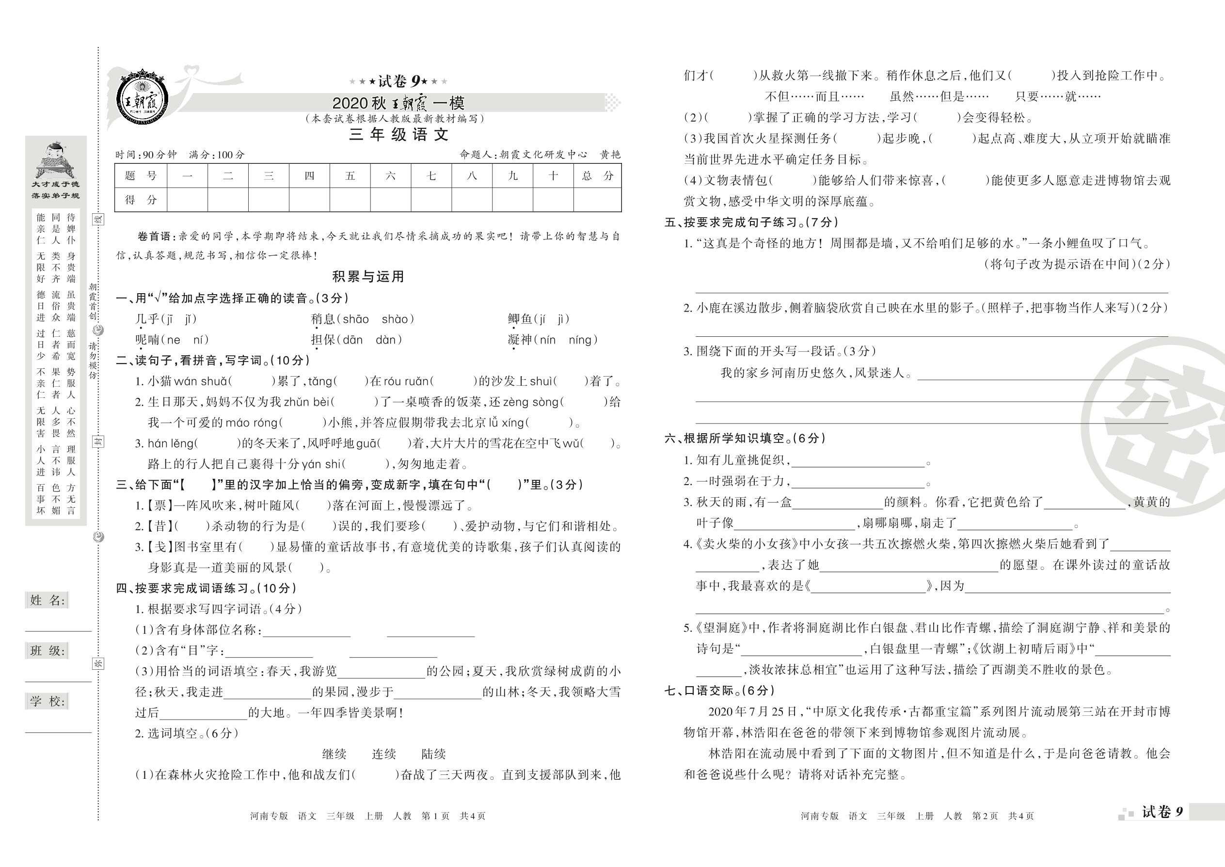 王朝霞期末模拟卷三年级上册语文(人教版)_R21080184652【9】