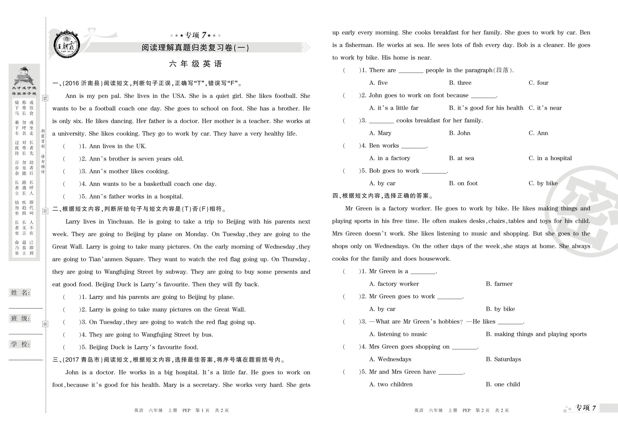 王朝霞期末专项卷——阅读理解真题归类复习六年级上册英语(PEP版)_R210807172202【0】