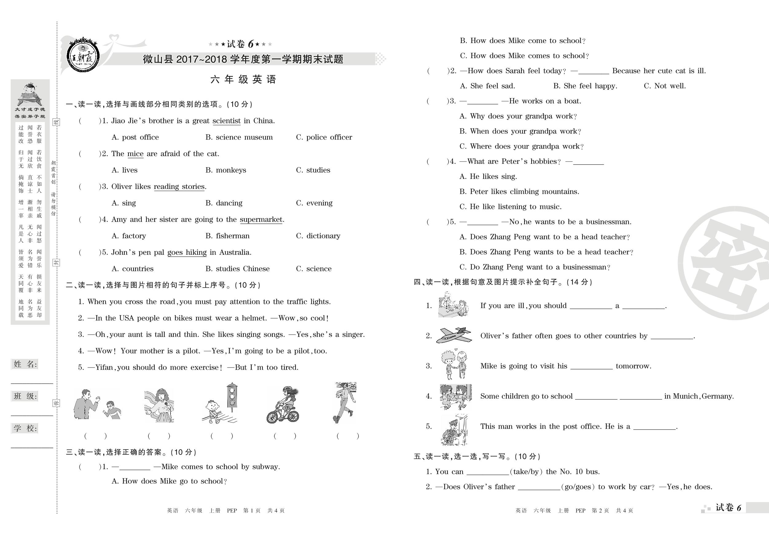 2017-2018学年第一学期济宁市微山县六年级英语试卷(PEP版)【6】