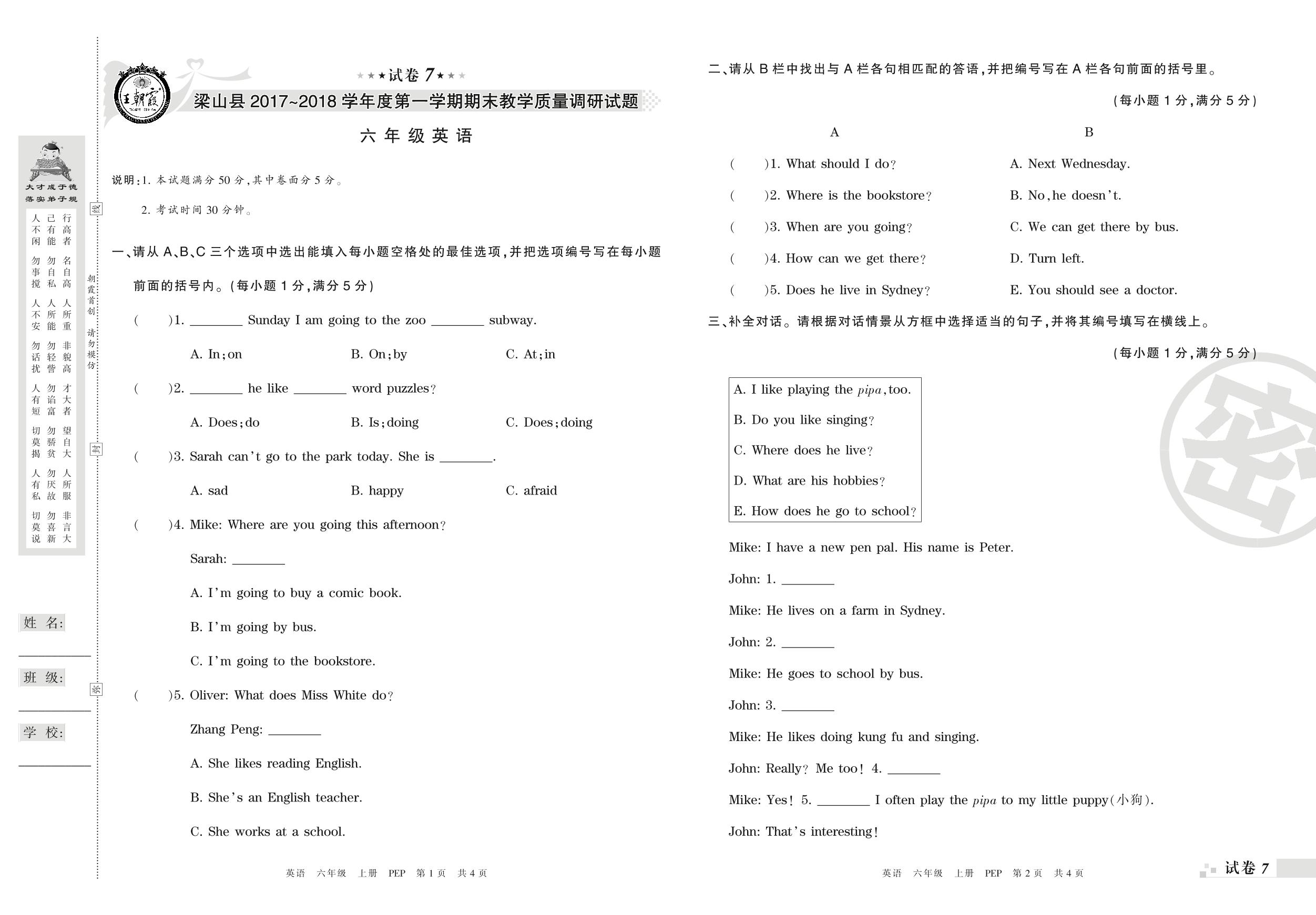 2017-2018学年第一学期济宁市梁山县六年级英语试卷(PEP版)【7】