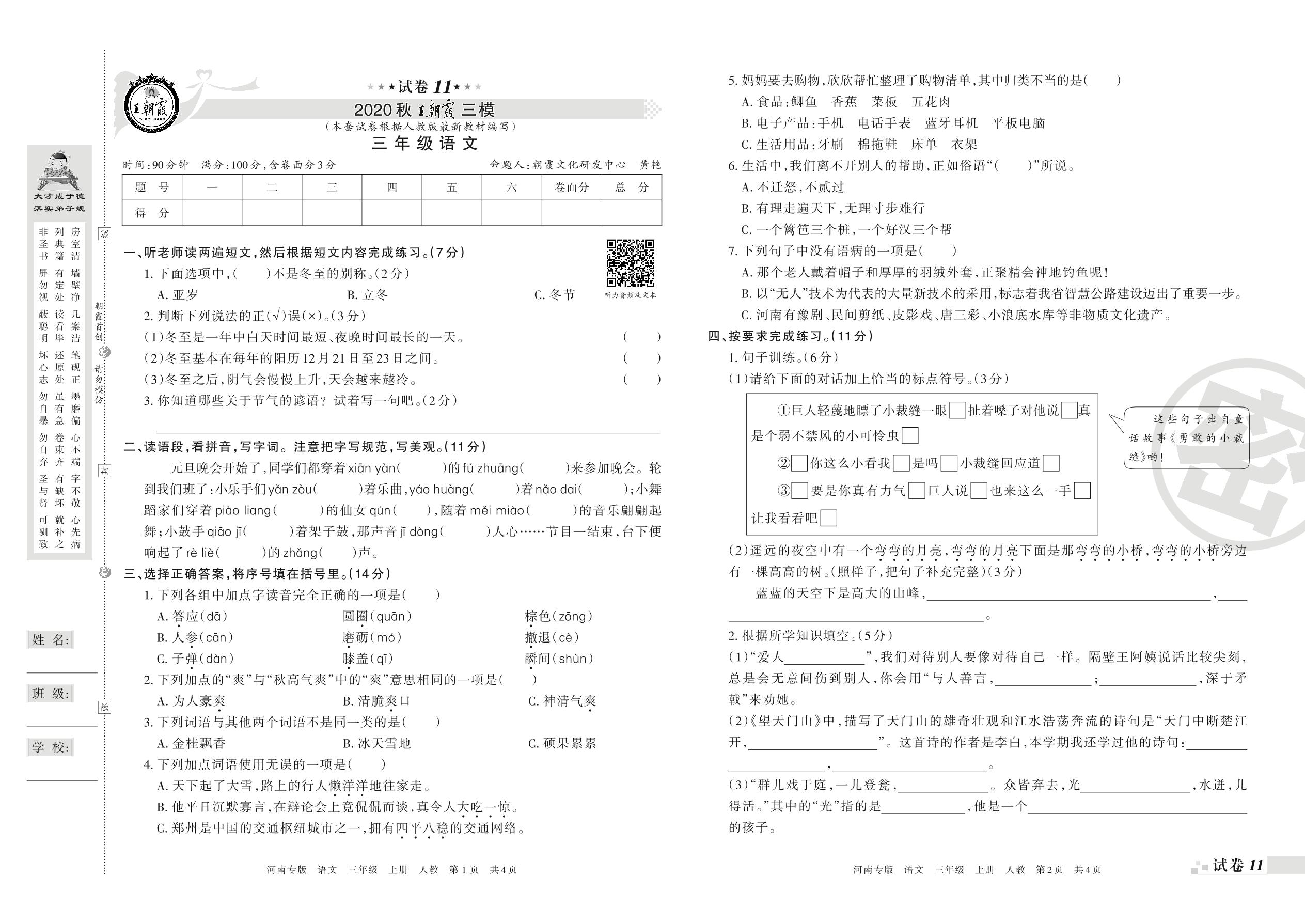 王朝霞期末模拟卷三年级上册语文(人教版)_R21080184705【11】