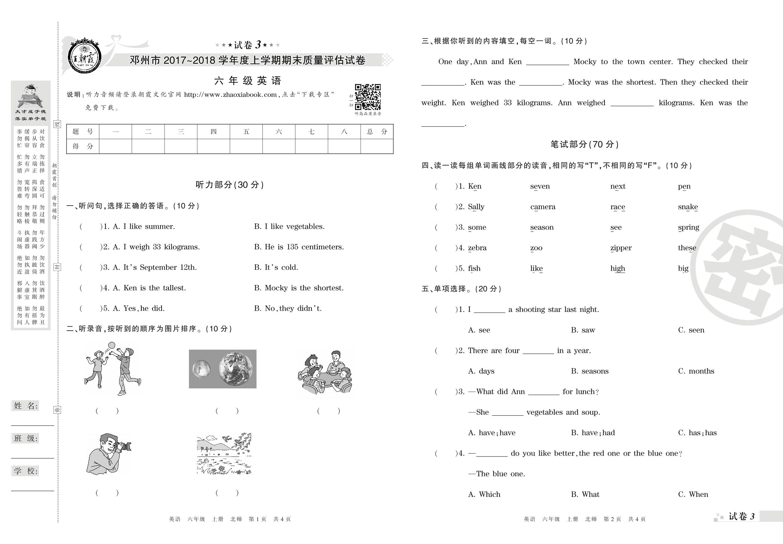 2017-2018学年第一学期邓州市六年级英语试卷(北师版)【3】