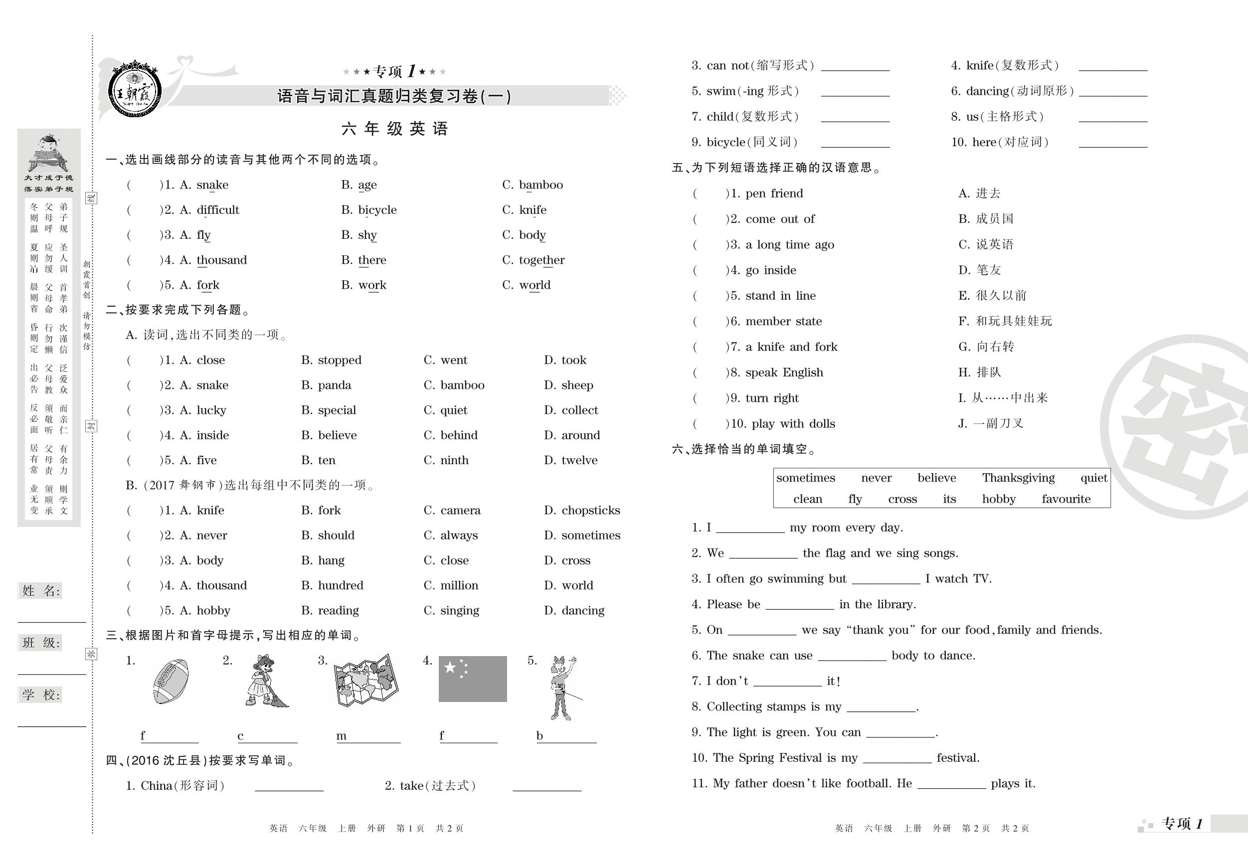 王朝霞期末专项卷——语音与词汇真题归类复习六年级上册英语(外研版)_R210807172346【0】