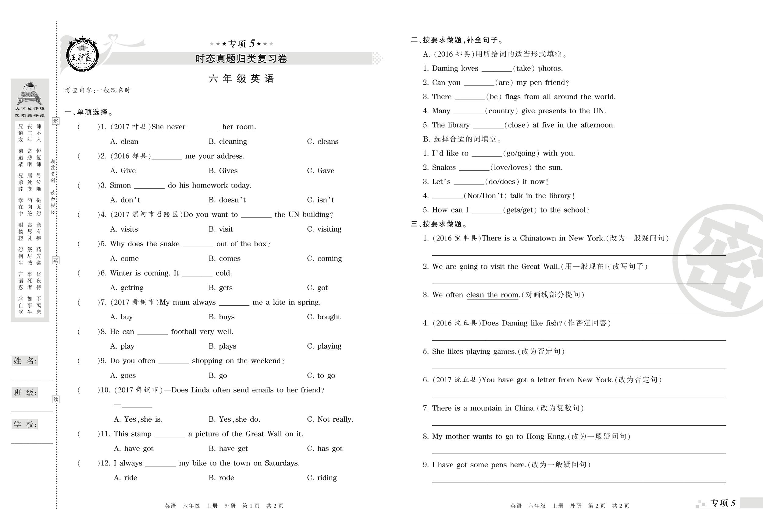 王朝霞期末专项卷——时态、情景交际真题归类复习六年级上册英语(外研版)_R210807172356【0】