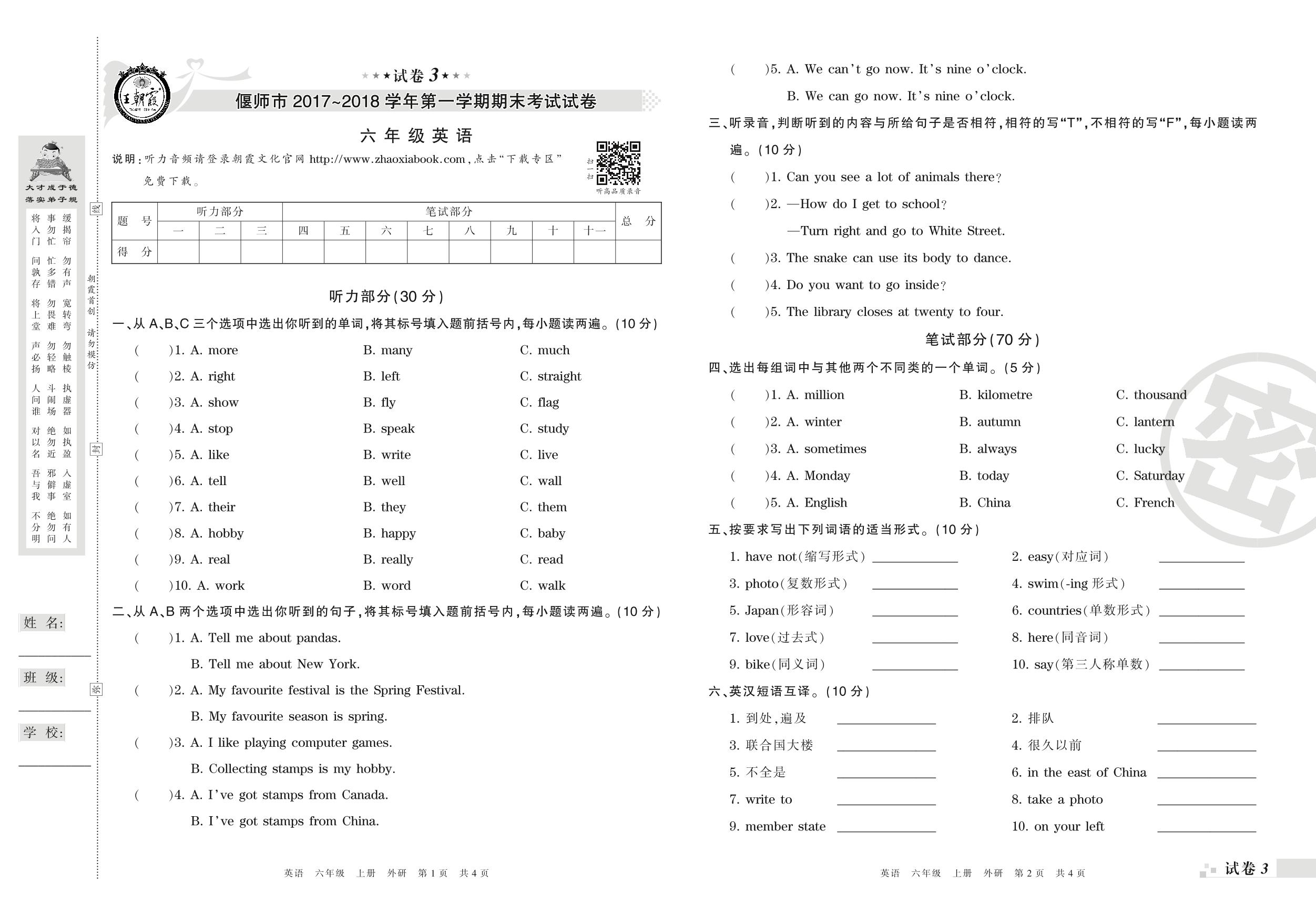 2017-2018学年第一学期偃师市六年级英语试卷(外研版)【3】