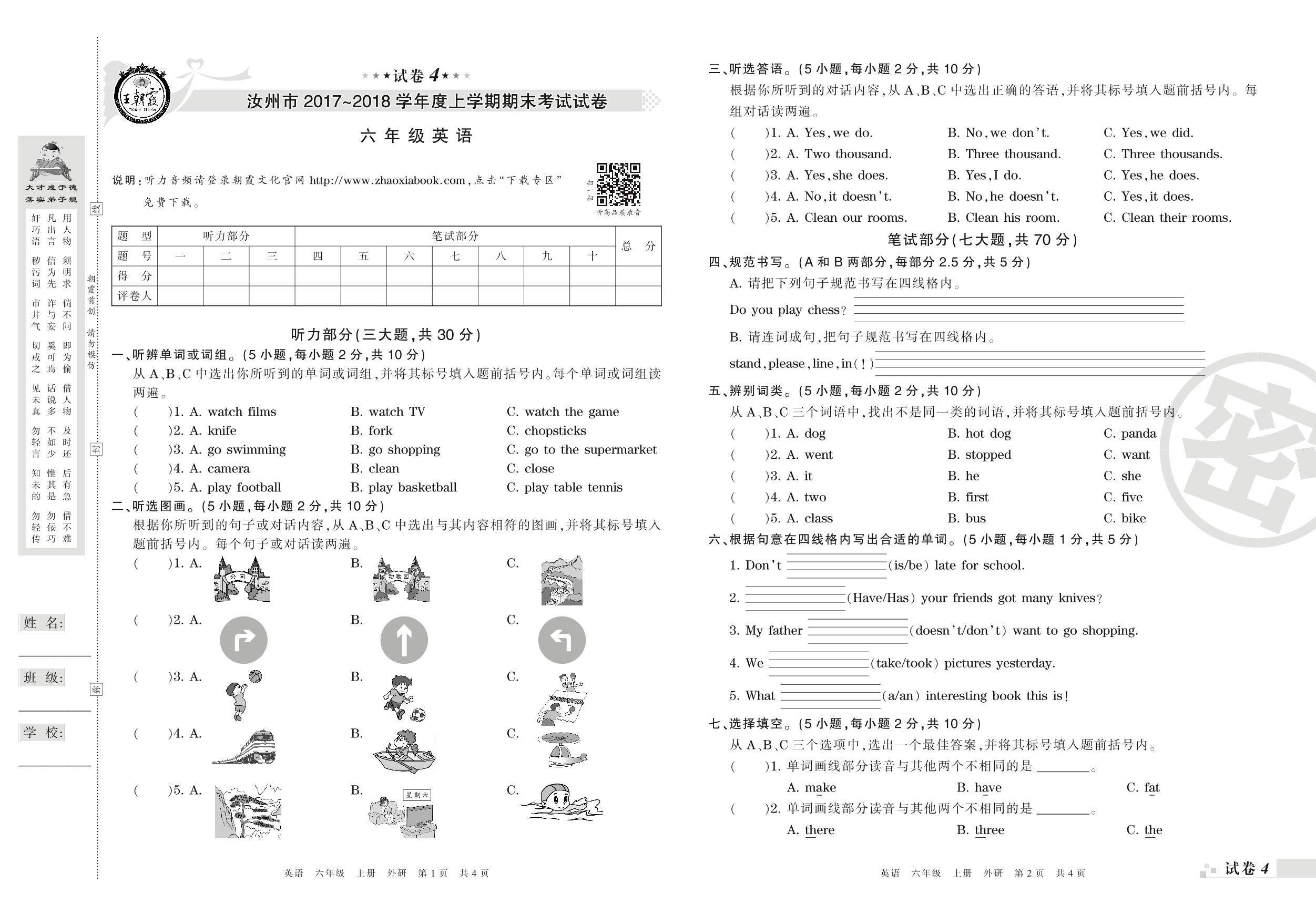 2017-2018学年第一学期汝州市六年级英语试卷(外研版)【4】