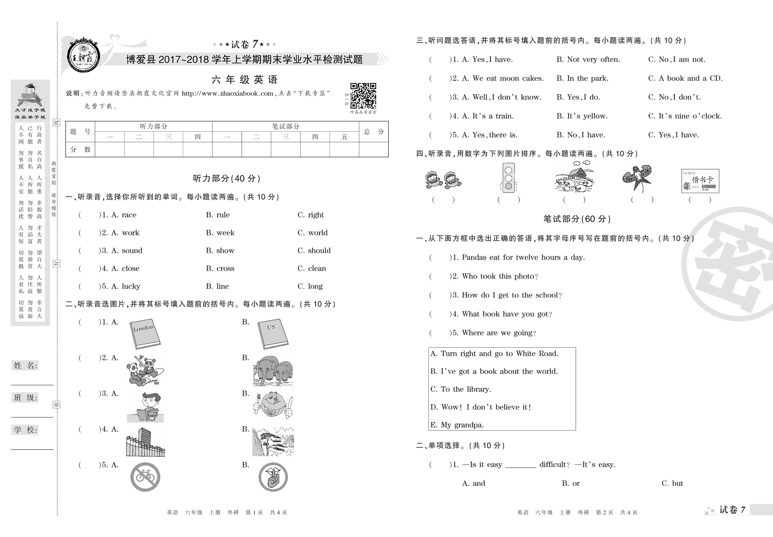2017-2018学年第一学期焦作市博爱县六年级英语试卷(外研版)【7】