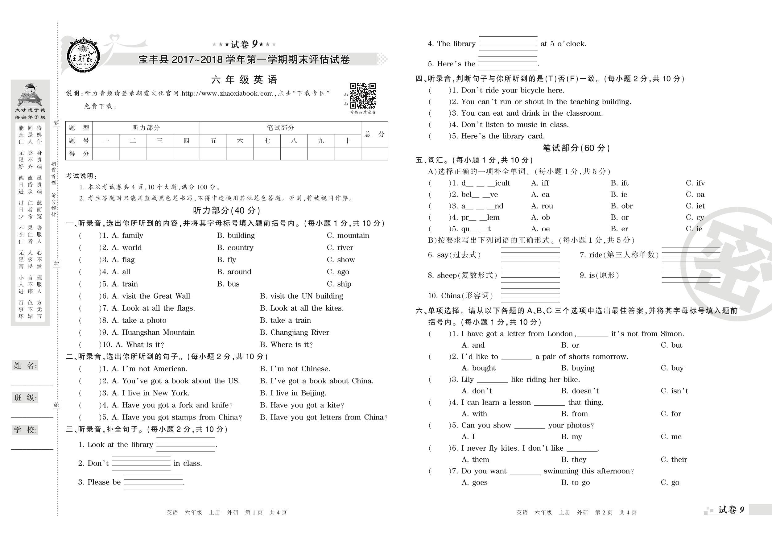 2017-2018学年第一学期平顶山市宝丰县六年级英语试卷(外研版)【9】