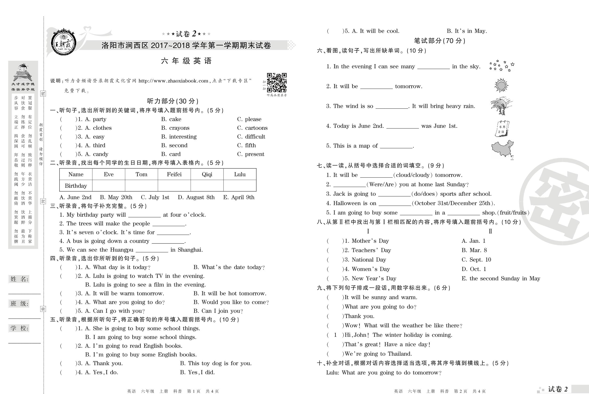 2017-2018学年第一学期洛阳市涧西区六年级英语试卷(科普版)【2】