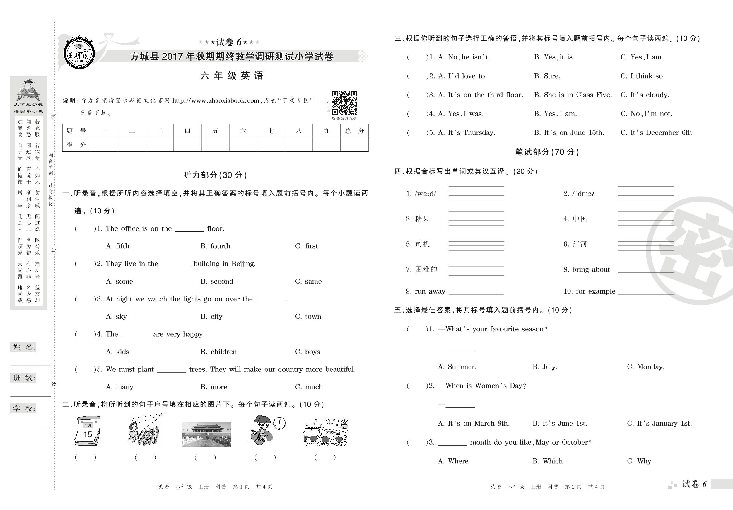 2017-2018学年第一学期南阳市方城县六年级英语试卷(科普版)【6】