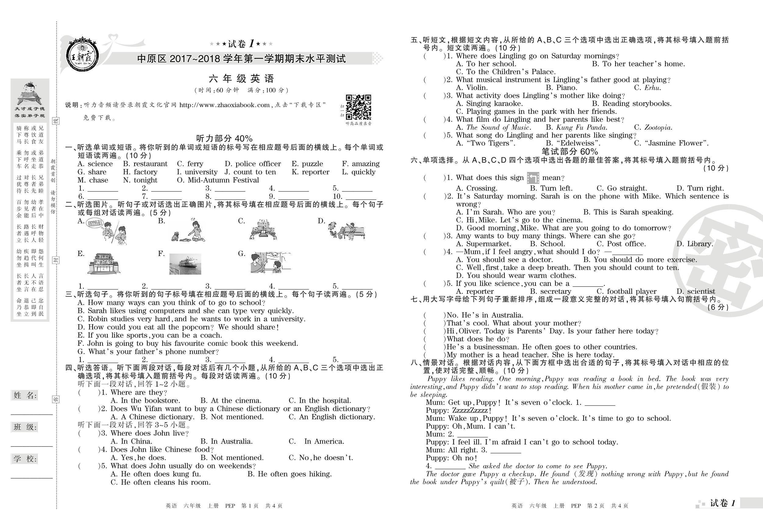 2017-2018学年第一学期郑州市中原区六年级英语试卷(PEP版)【1】
