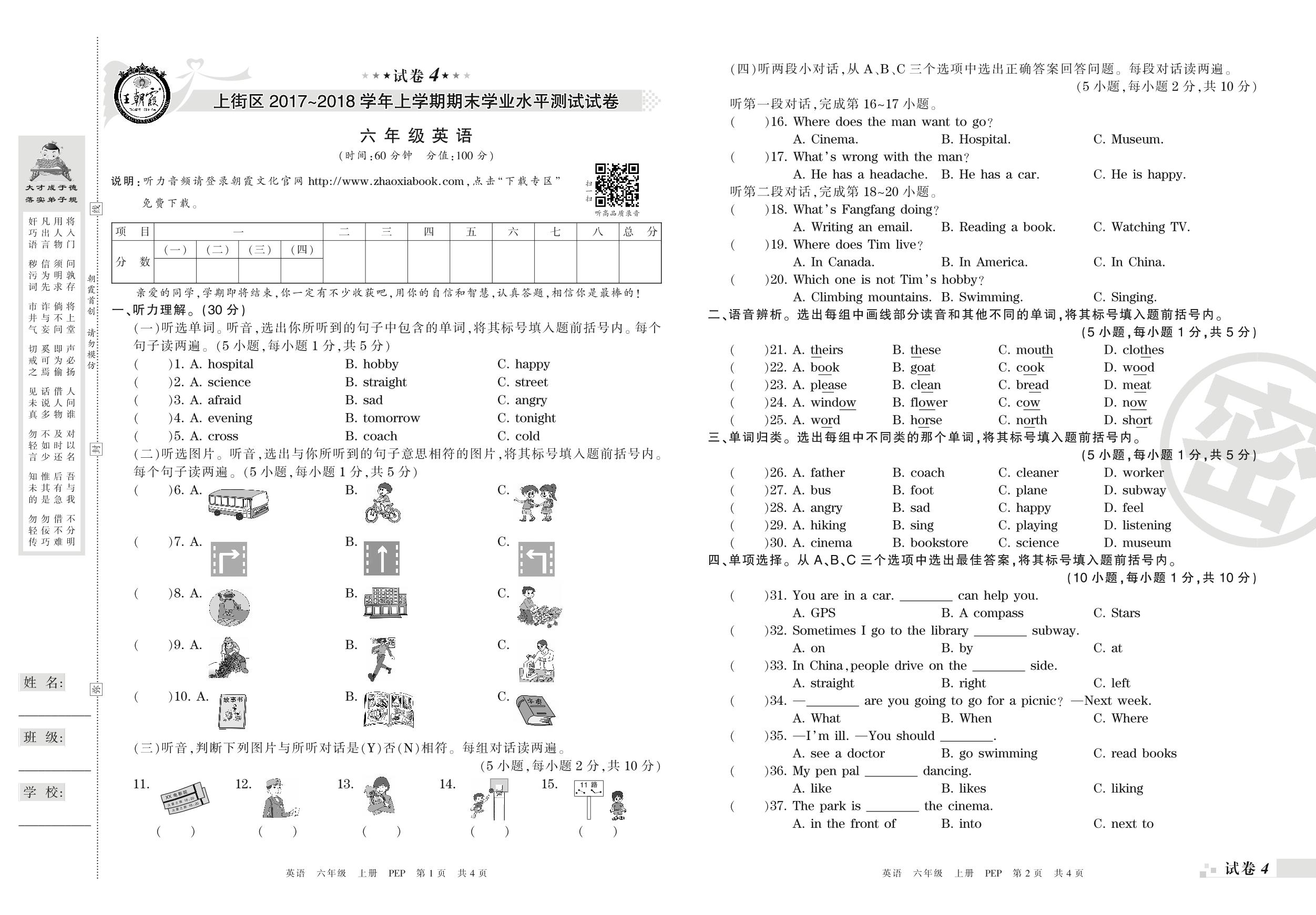 2017-2018学年第一学期郑州市上街区六年级英语试卷(PEP版)【4】