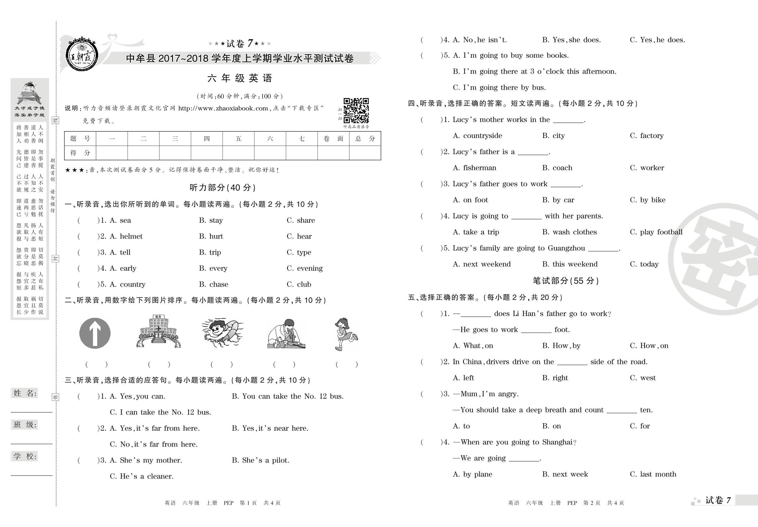2017-2018学年第一学期郑州市中牟县六年级英语试卷(PEP版)【7】