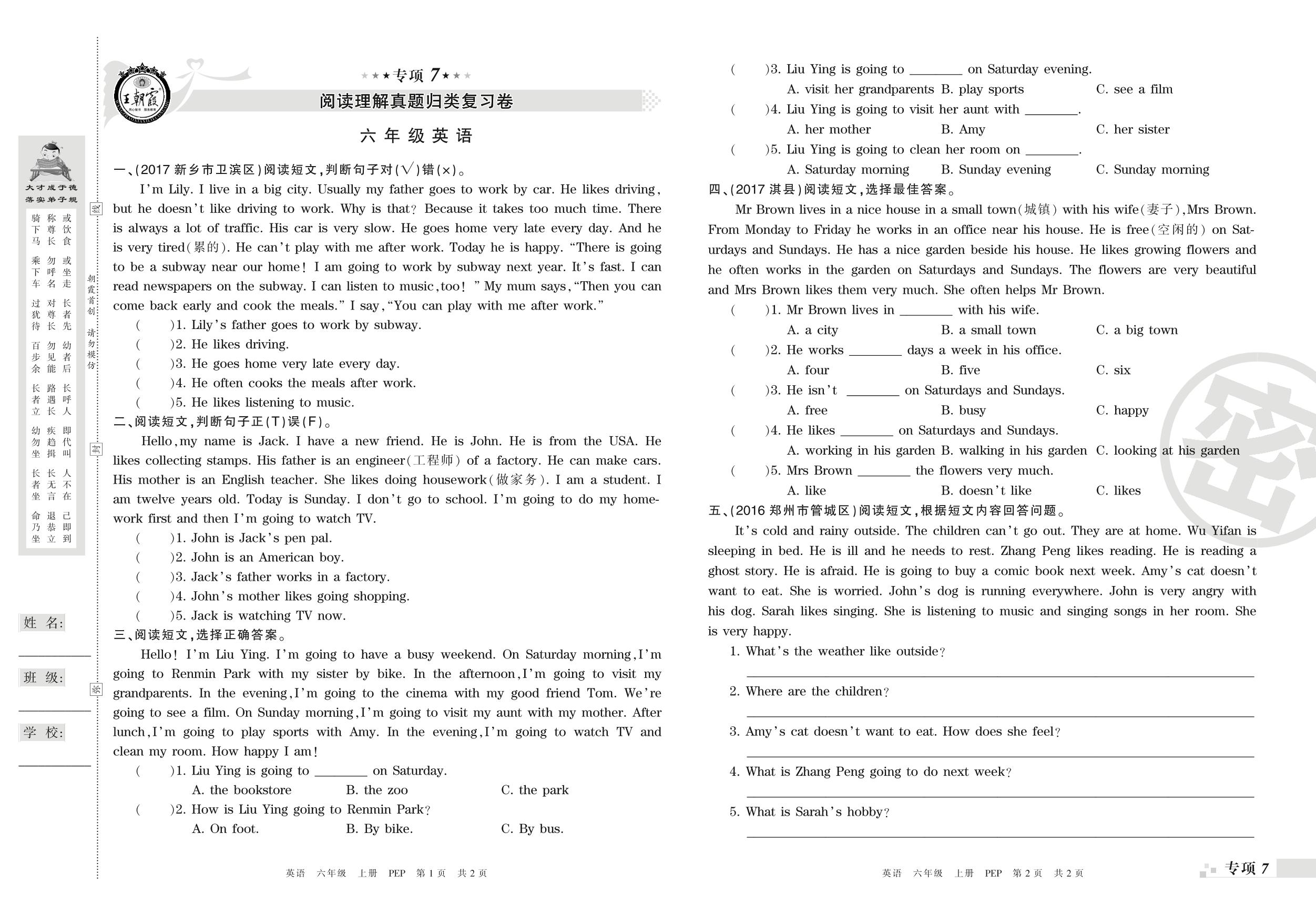 王朝霞期末专项卷——阅读理解、写作真题归类复习六年级上册英语(PEP版)_R210807172651【0】
