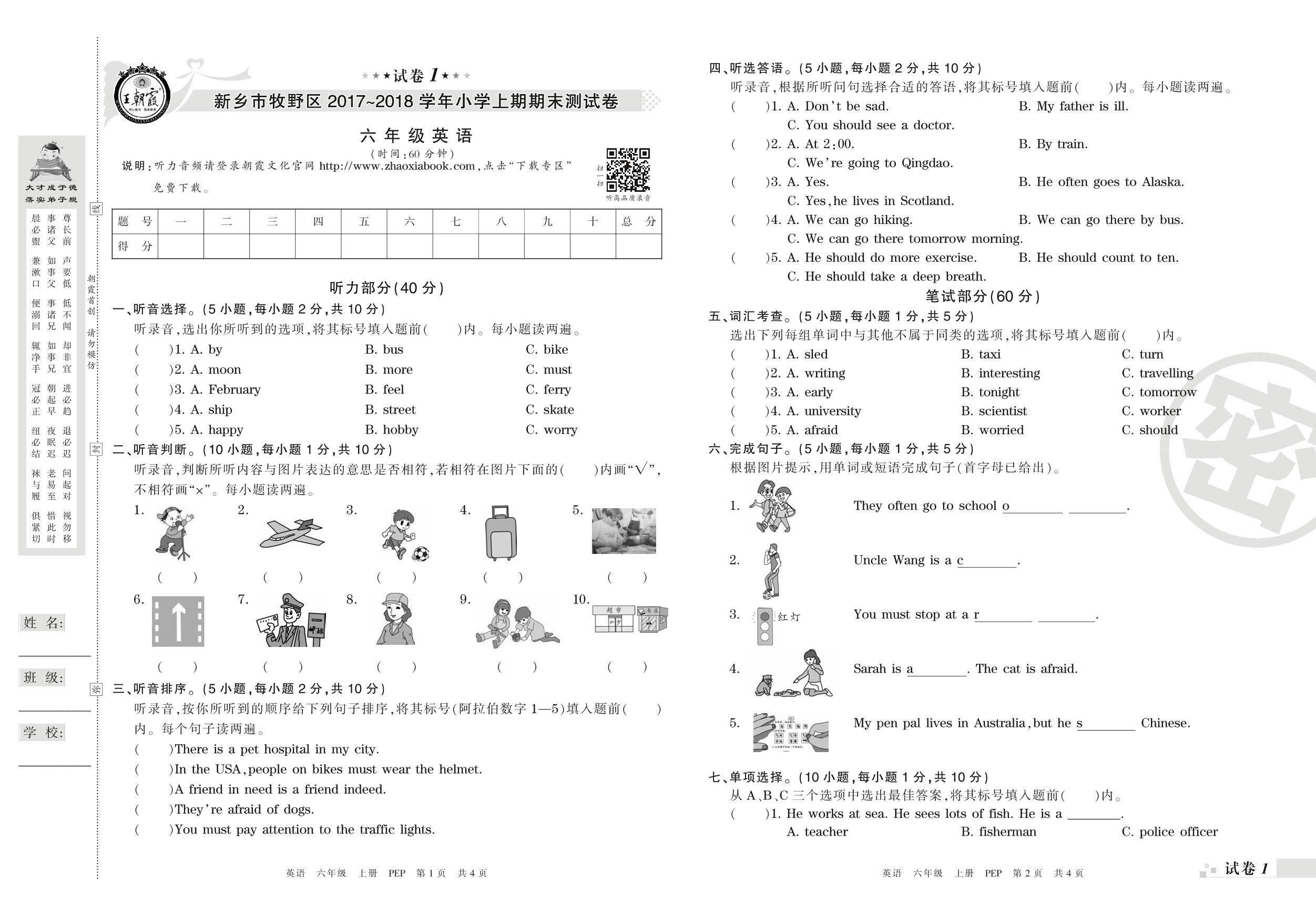 2017-2018学年第一学期新乡市牧野六年级英语试卷(PEP版)【1】