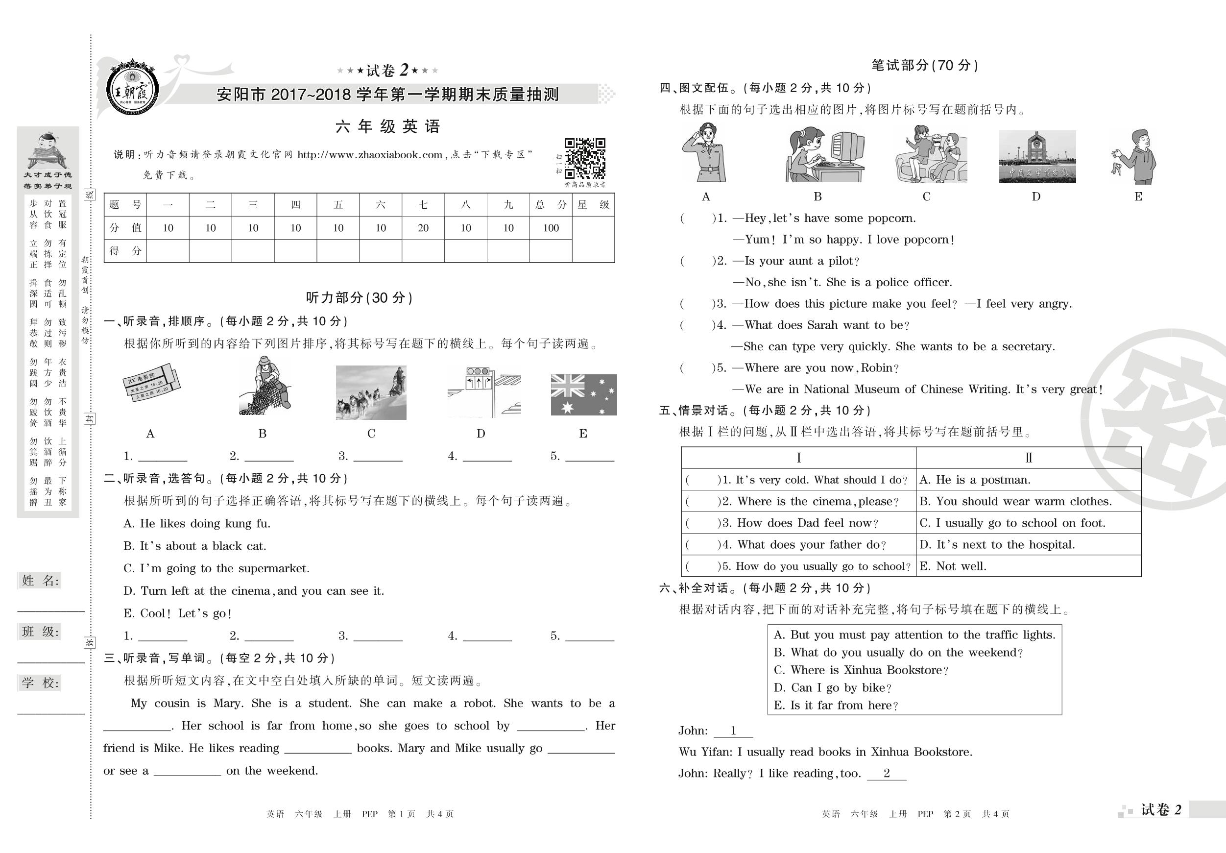 2017-2018学年第一学期安阳市六年级英语试卷(PEP版)【2】