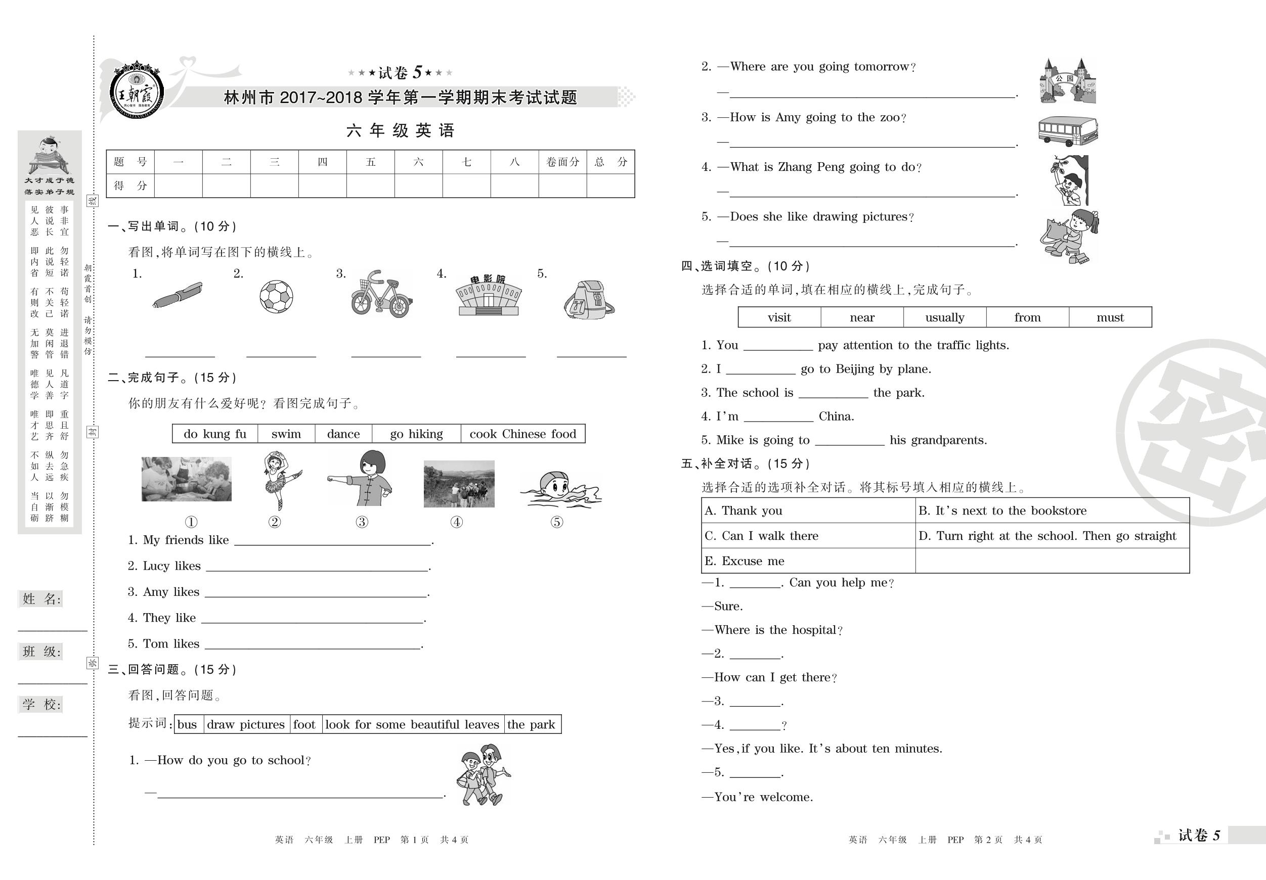 2017-2018学年第一学期林州市六年级英语试卷(PEP版)【5】