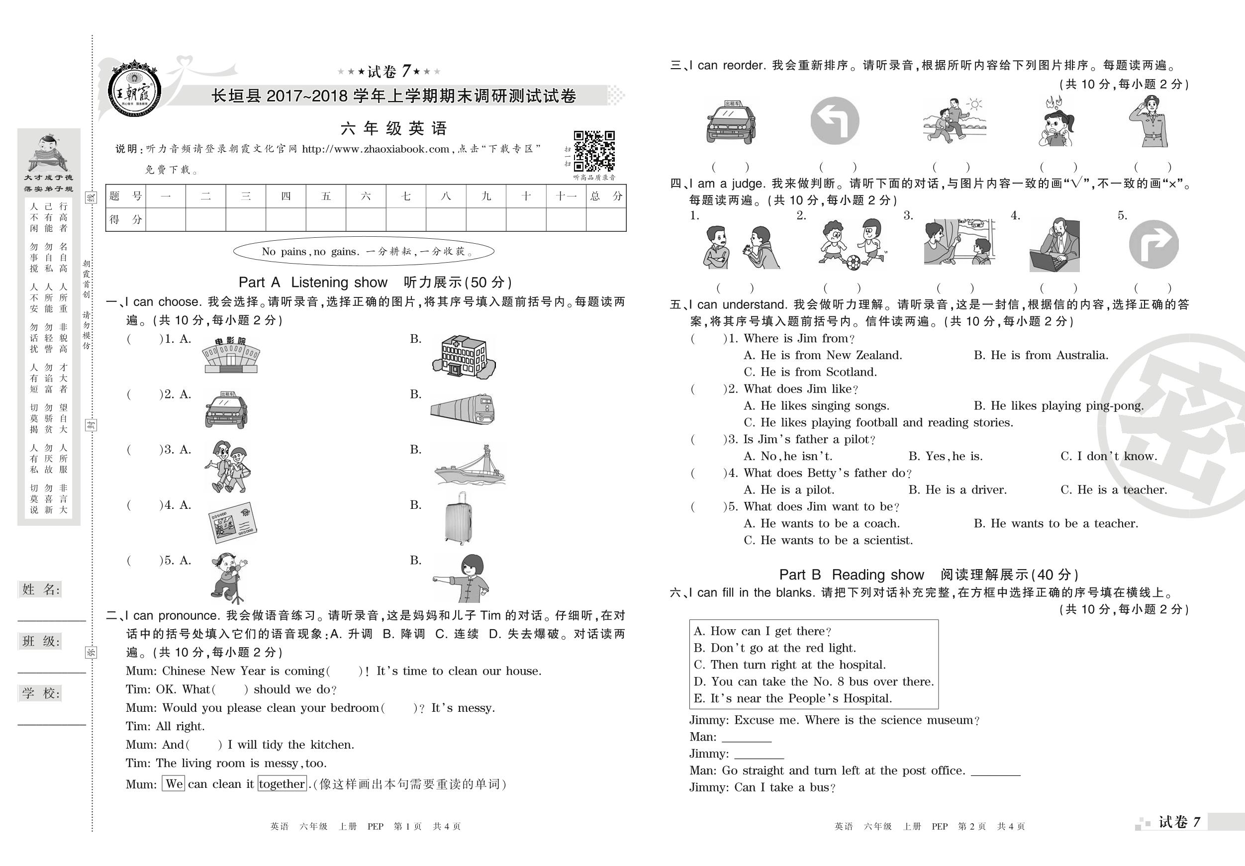 六年级英语人教PEP版(三起始)上册期末卷