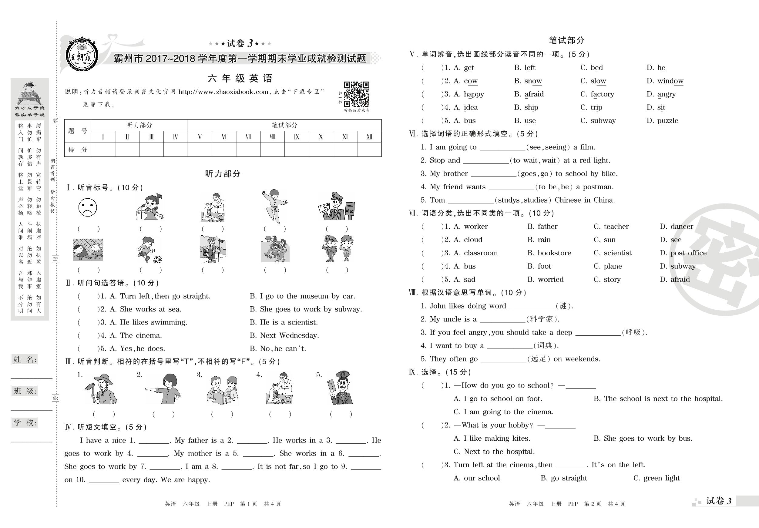2017-2018学年第一学期霸州市六年级英语试卷(PEP版)【3】